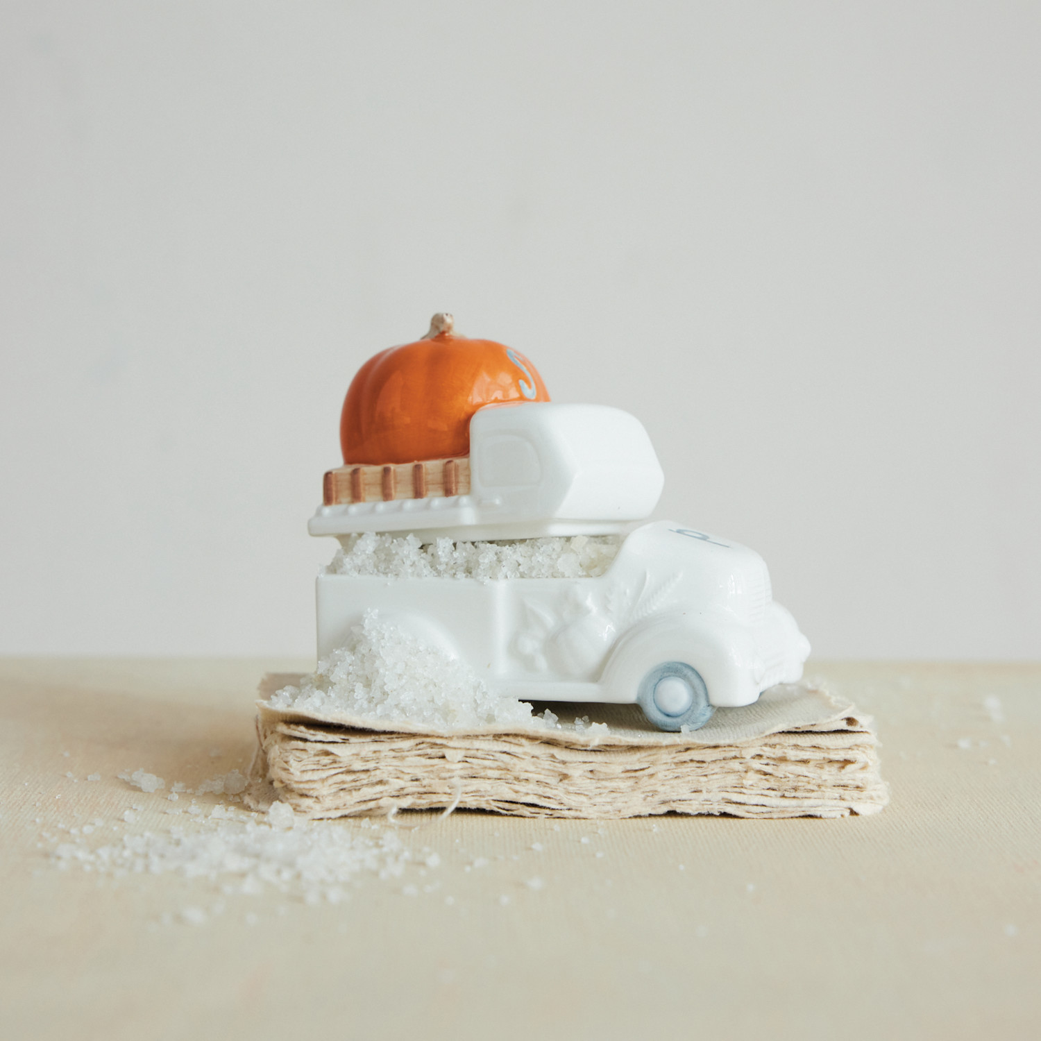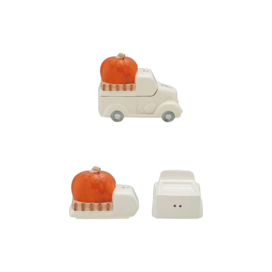 Ceramic Pumpkin on Truck Shaped Salt & Pepper Shakers, White & Orange Color, Set of 2