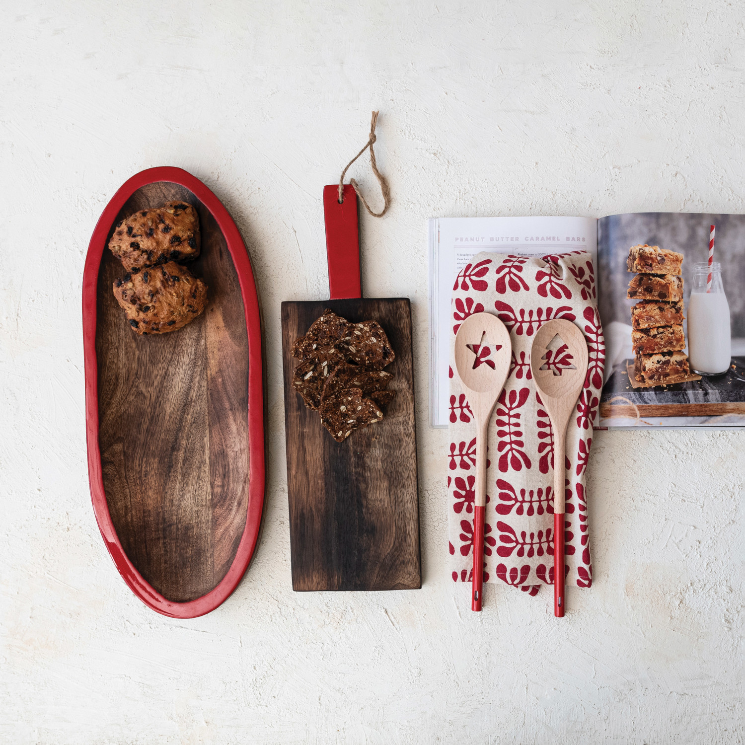 Hand-Carved Mango Wood Tray w/ Enameled Edge, Walnut Finish, Red