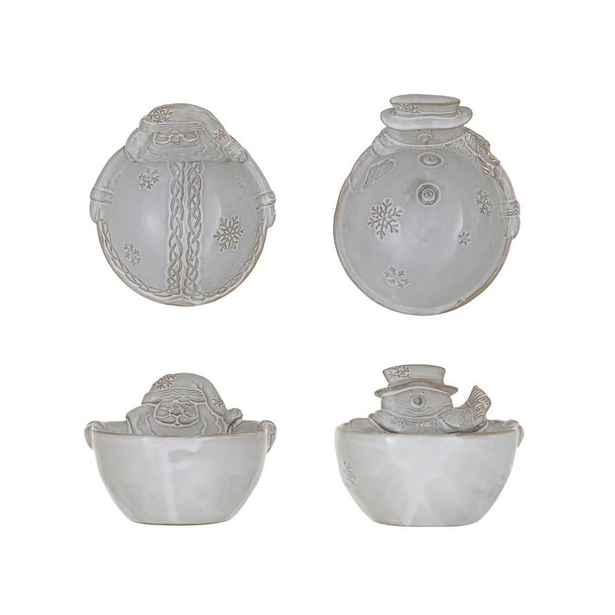 Catalog Name: 5"L x 4-3/4"W x 3-1/2"H Stoneware Santa/Snowman Shaped Bowl w/ Snowflakes, Reactive Glaze, Antique White, 2 Styles (Each One Will Vary)