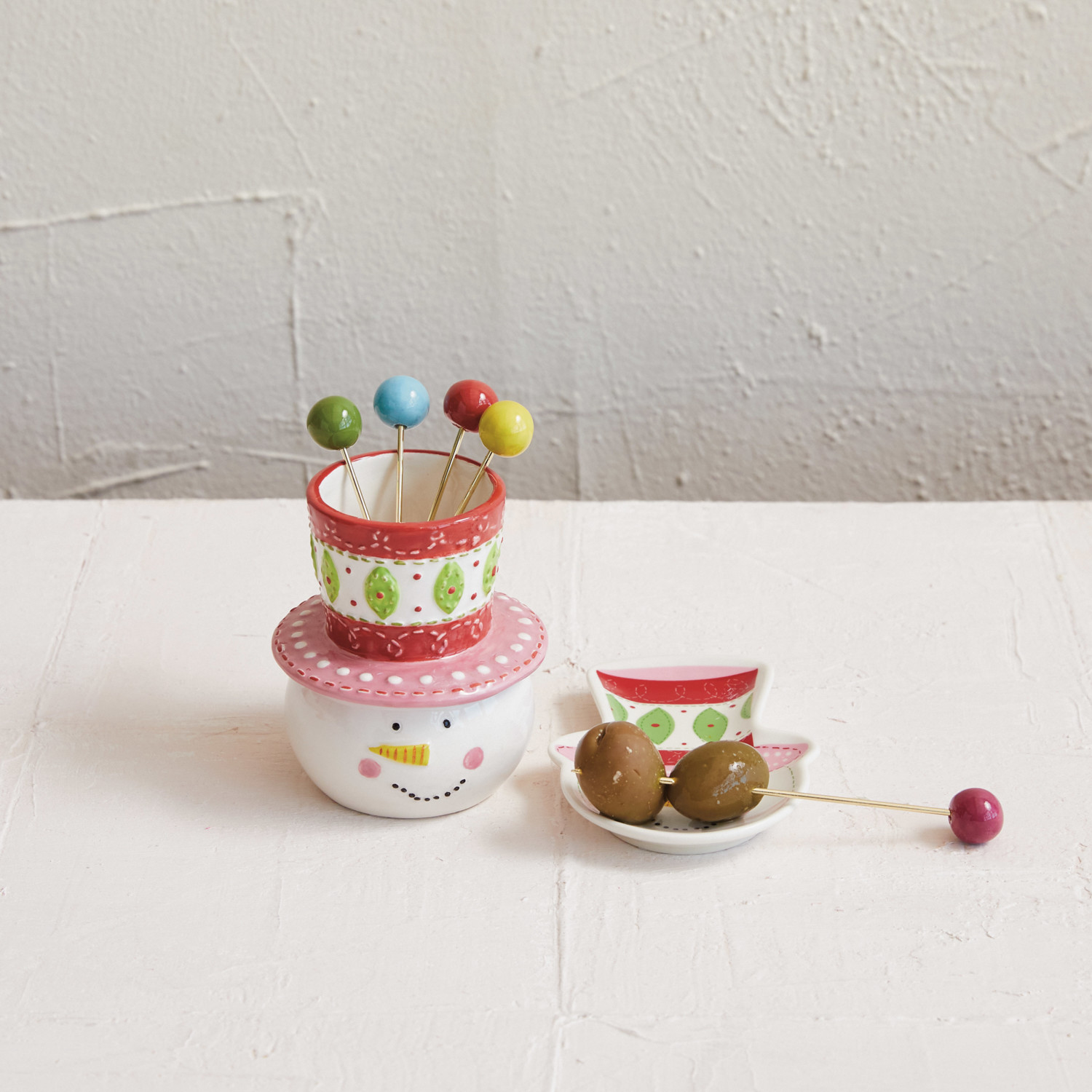 This ceramic holder and picks set features a snowman shape and a multicolor scheme that includes white, black, red, and green. The holder has a round and smooth shape that mimics a real snowman and a hole on the top for inserting the picks. The picks have metal stems and ceramic handles that match the holder. They are ideal for holding and serving appetizers, snacks, or fruits in a festive and fun way. The holder and picks are made of dolomite and metal, which are durable, easy to clean, and food-safe. They measure 3.5 inches in diameter, 4 inches in height for the holder, and 5.25 inches in length for each pick. This snowman-shaped ceramic holder and pick set will bring joy and style to the table. A ceramic holder with a snowman shape and five metal appetizer picks that add a touch of winter wonderland to the tableware. Perfect for holding and serving favorite appetizers, snacks, or fruits in a festive and fun way. The holder has a round and smooth shape that mimics a real snowman and a hole on the top for inserting the picks.