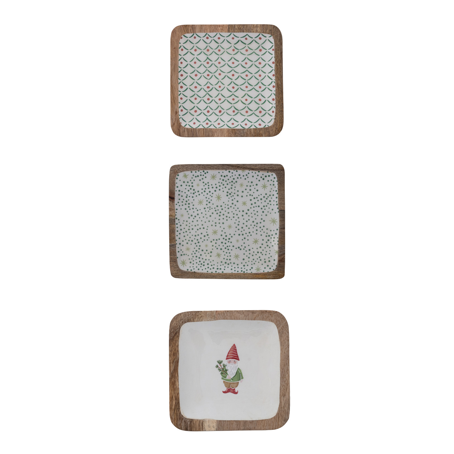 Catalog Name: 10" Square, 8" Square & 6-1/4" Square Enameled Mango Wood Trays w/ Patterns/Gnome, Multi Color, Set of 3 ©