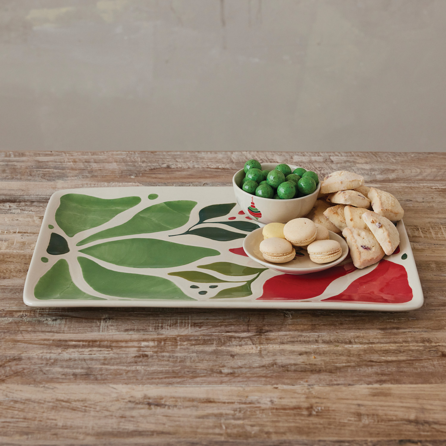 Catalog Name: 18"L x 13"W Hand-Painted Stoneware Platter w/ Wax Relief Poinsettia Pattern, Green, Red & Cream Color