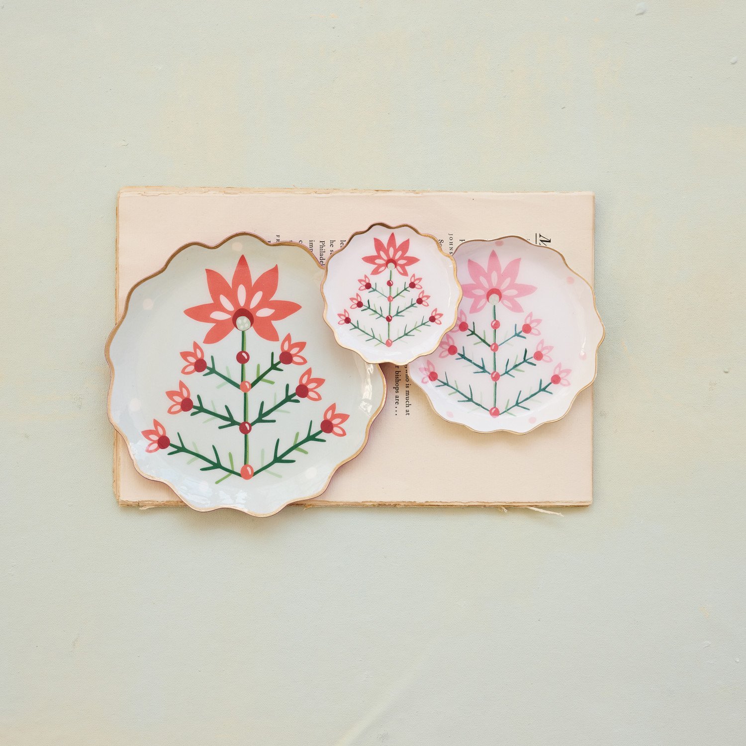 Enameled Metal Scalloped Trays with Holiday Botanicals & Gold Edges, Set of 3 ©