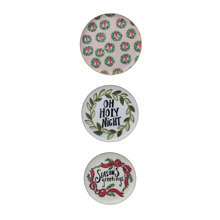 Enameled Metal Trays with Holiday Pattern/Saying & Gold Edges, Set of 3 ©
