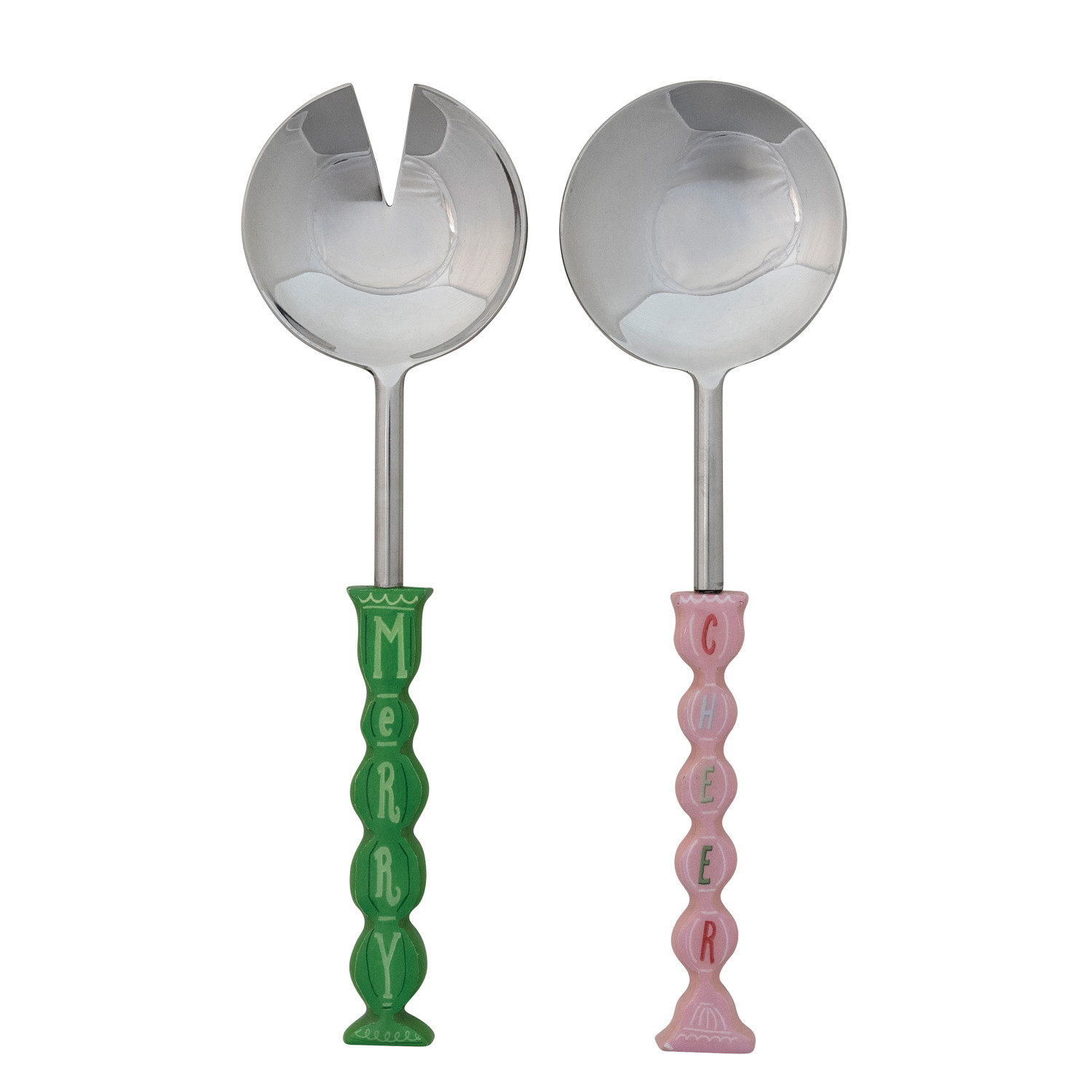 Catalog Name: 11"L Enameled Metal Salad Servers w/ Holiday Words & Colored Handles "Merry/Cheer", Multi Color, Set of 2 ©