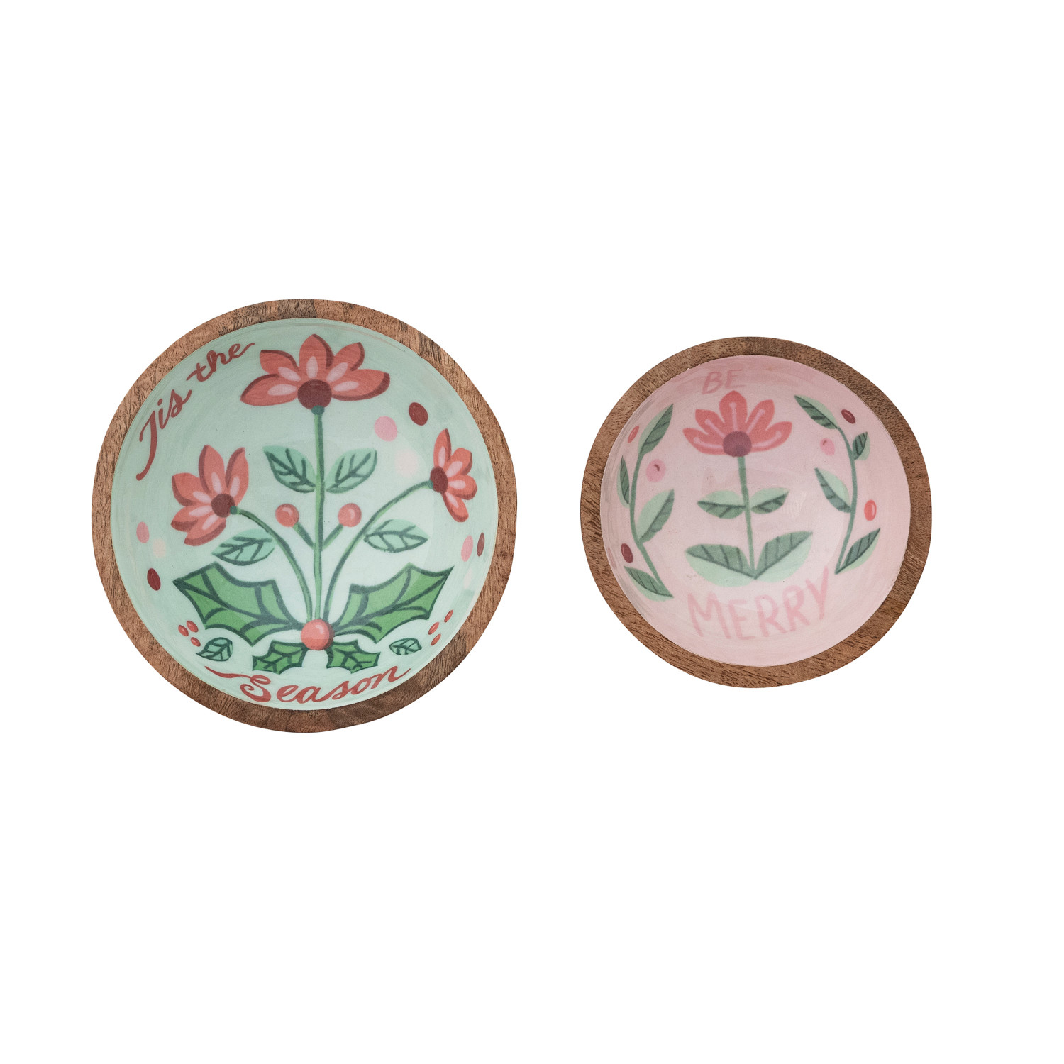 Catalog Name: 6" Round x 2-3/4"H & 5" Round x 2-3/4"H Enameled Mango Wood Bowls w/ Holiday Botanicals & Saying, Multi Color & Natural, Set of 2 ©