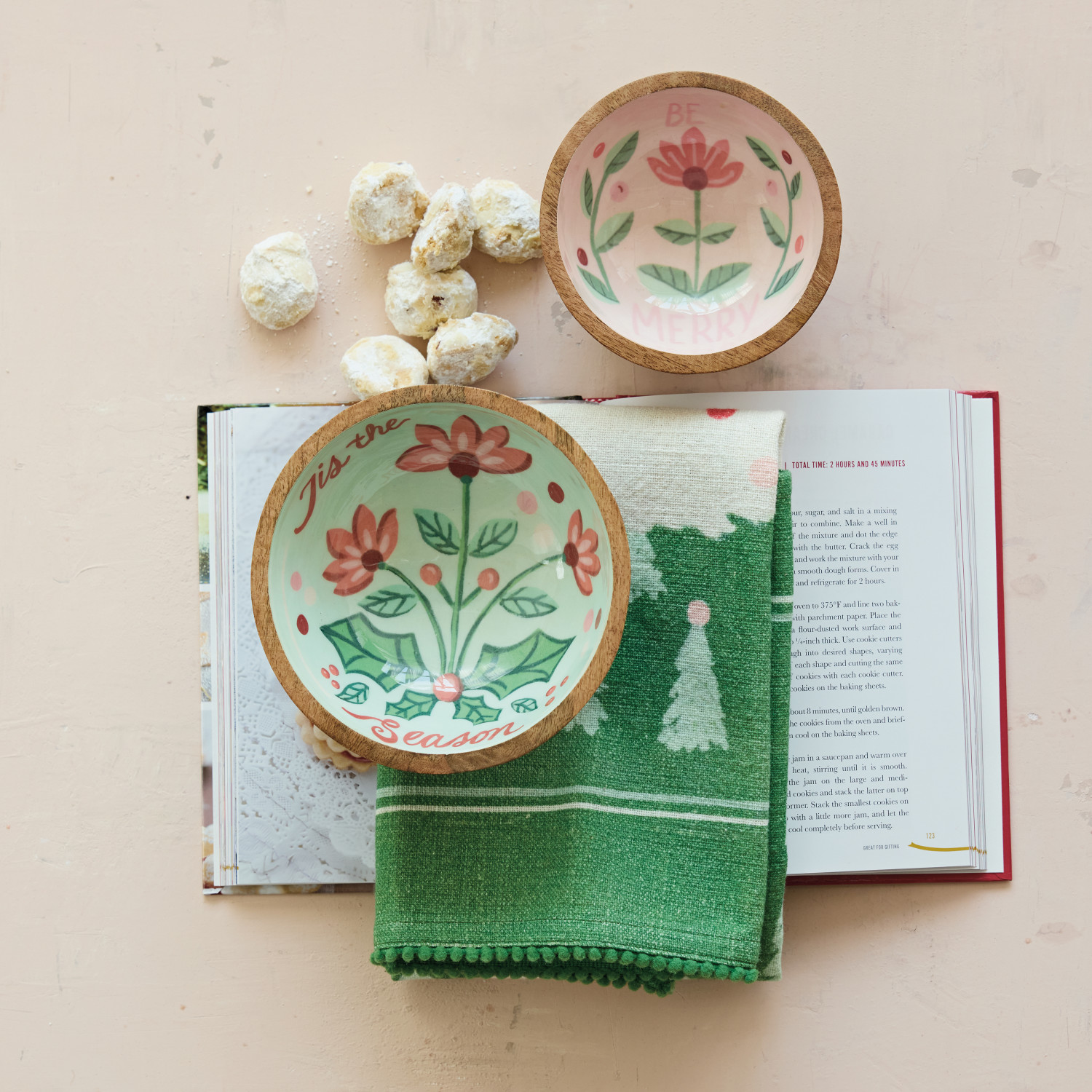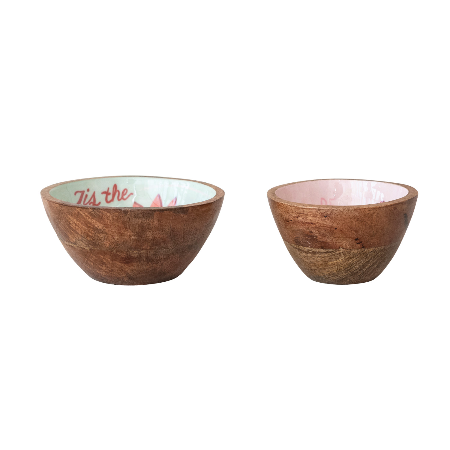 Enameled Mango Wood Bowls with Holiday Botanicals & Saying, Set of 2 ©