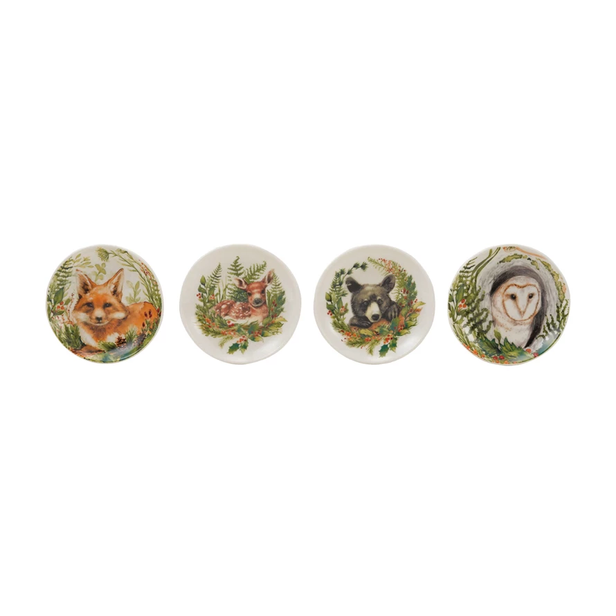 Catalog Name: 4" Round Stoneware Dish w/ Woodland Animal & Seasonal Botanicals, Multi Color, 4 Styles ©