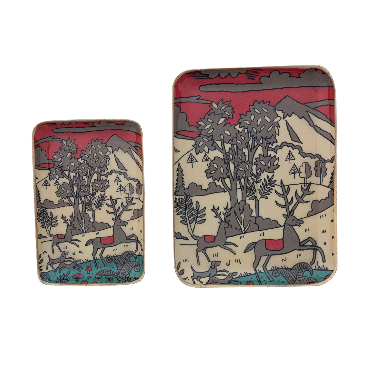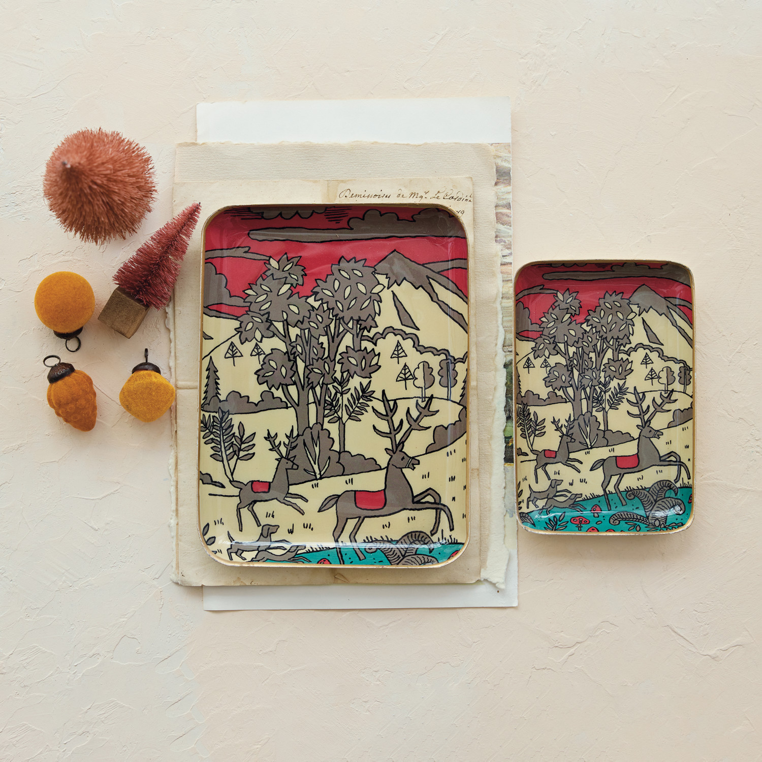 Enameled Metal Trays with Winter Scene, Reindeer & Gold Edges, Set of 2 ©