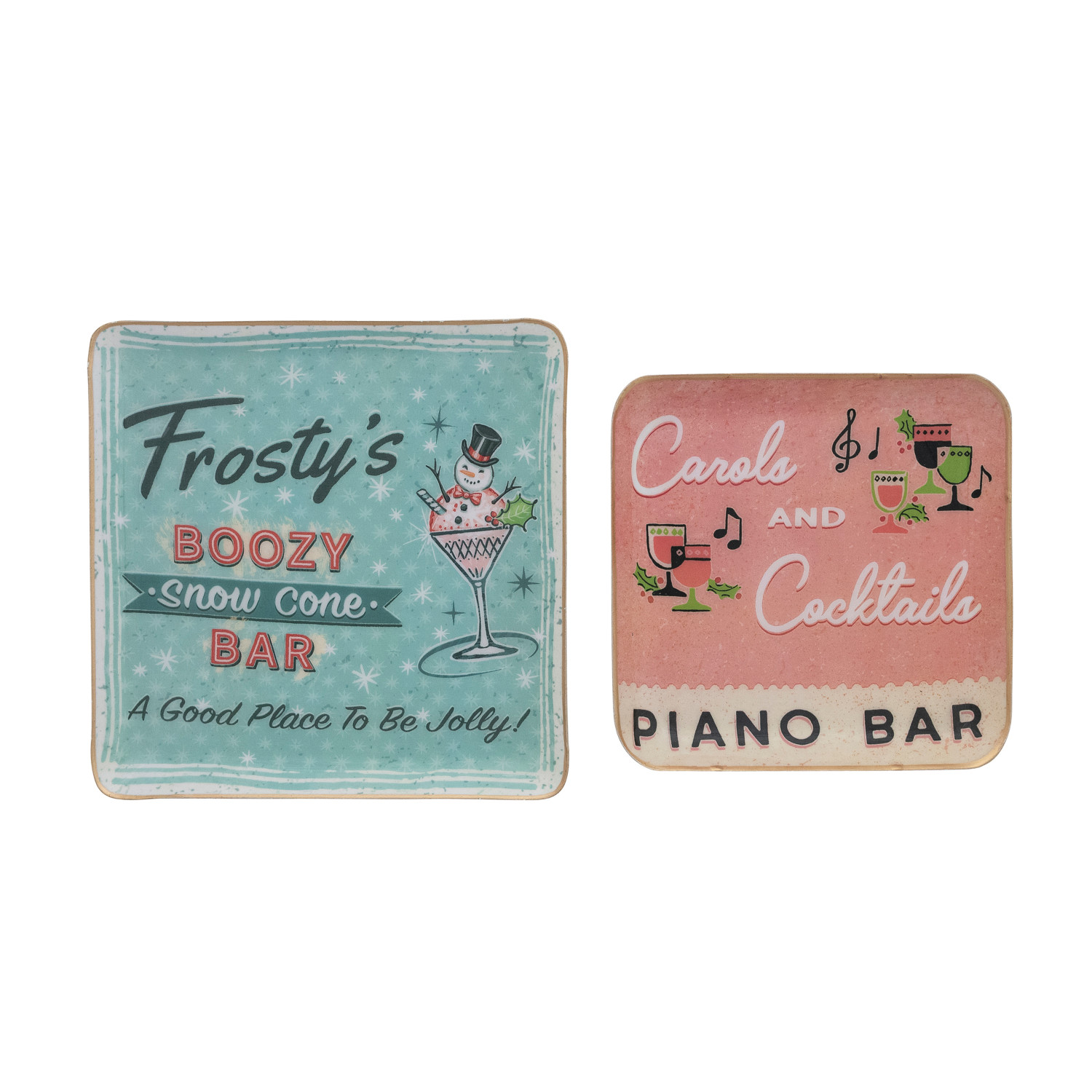 Catalog Name: 8-1/2" Square & 7" Square Enameled Metal Trays w/ Holiday Bar Images & Sayings, Multi Color, Set of 2 ©