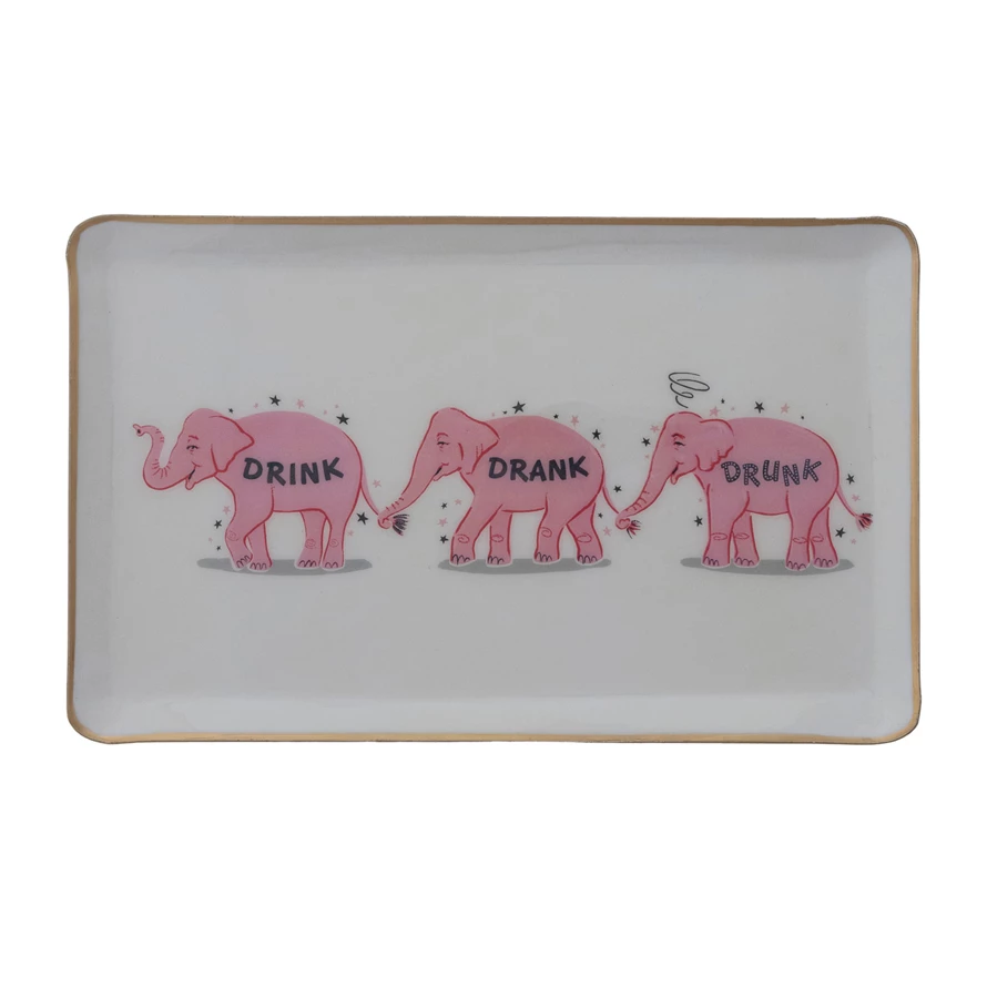 Catalog Name: 13"L x 8"W Enameled Metal Tray w/ Pink Elephants & Gold Edge "Drink, Drank, Drunk", Multi Color ©