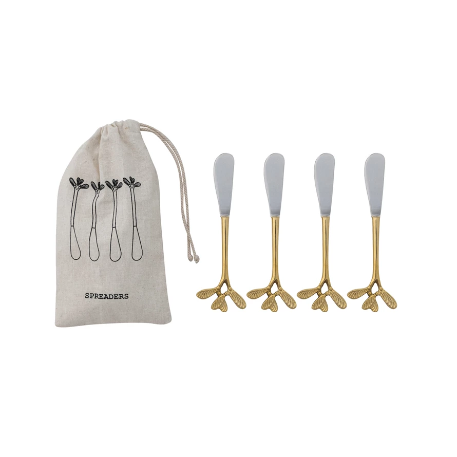 Catalog Name: 5-1/2"L Stainless Steel & Brass Canape Knives w/ Mistletoe Leaves & Berries Handles, Set of 4 in Printed Drawstring Bag