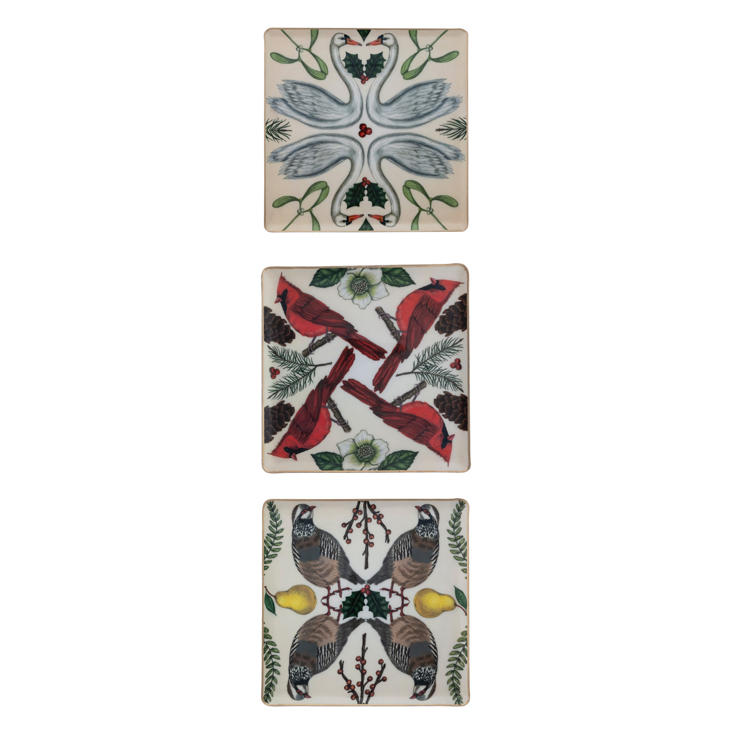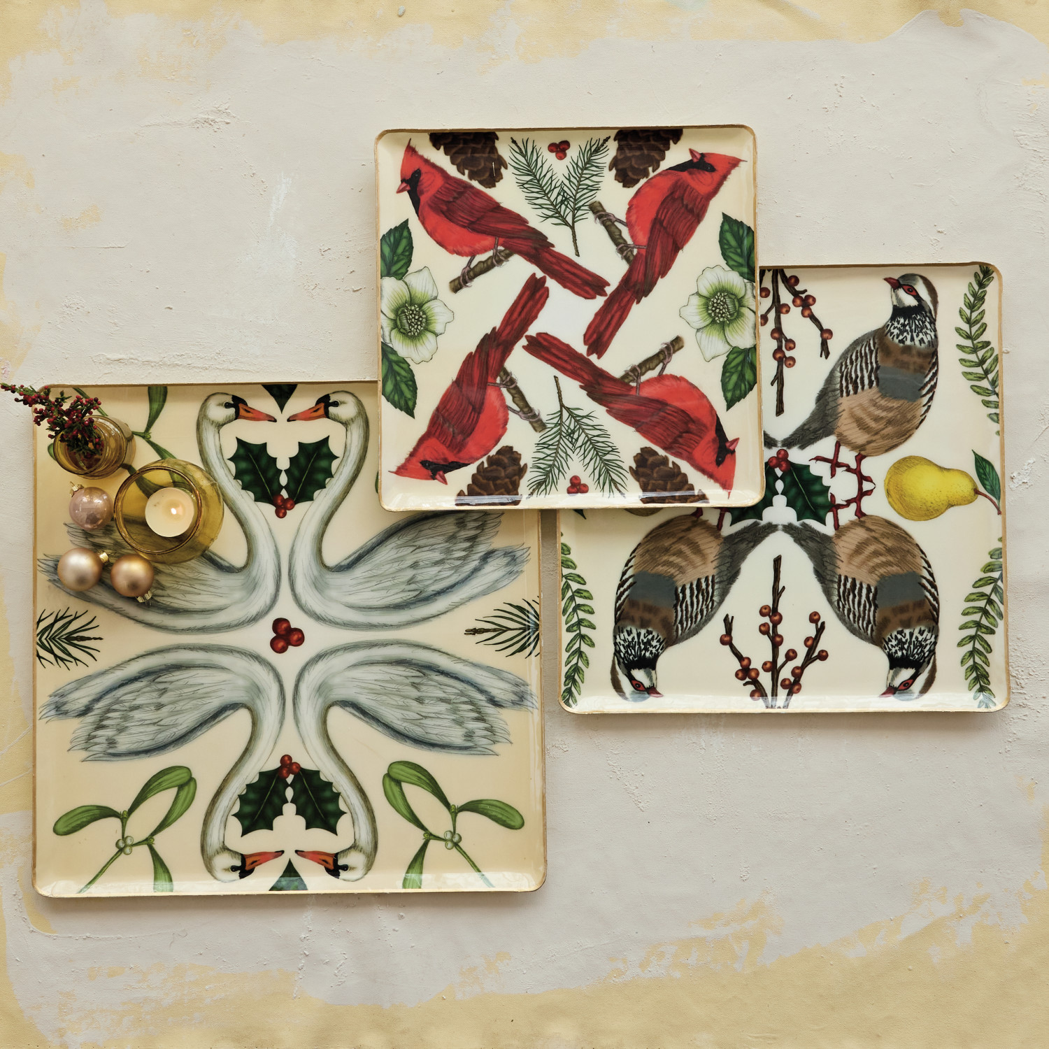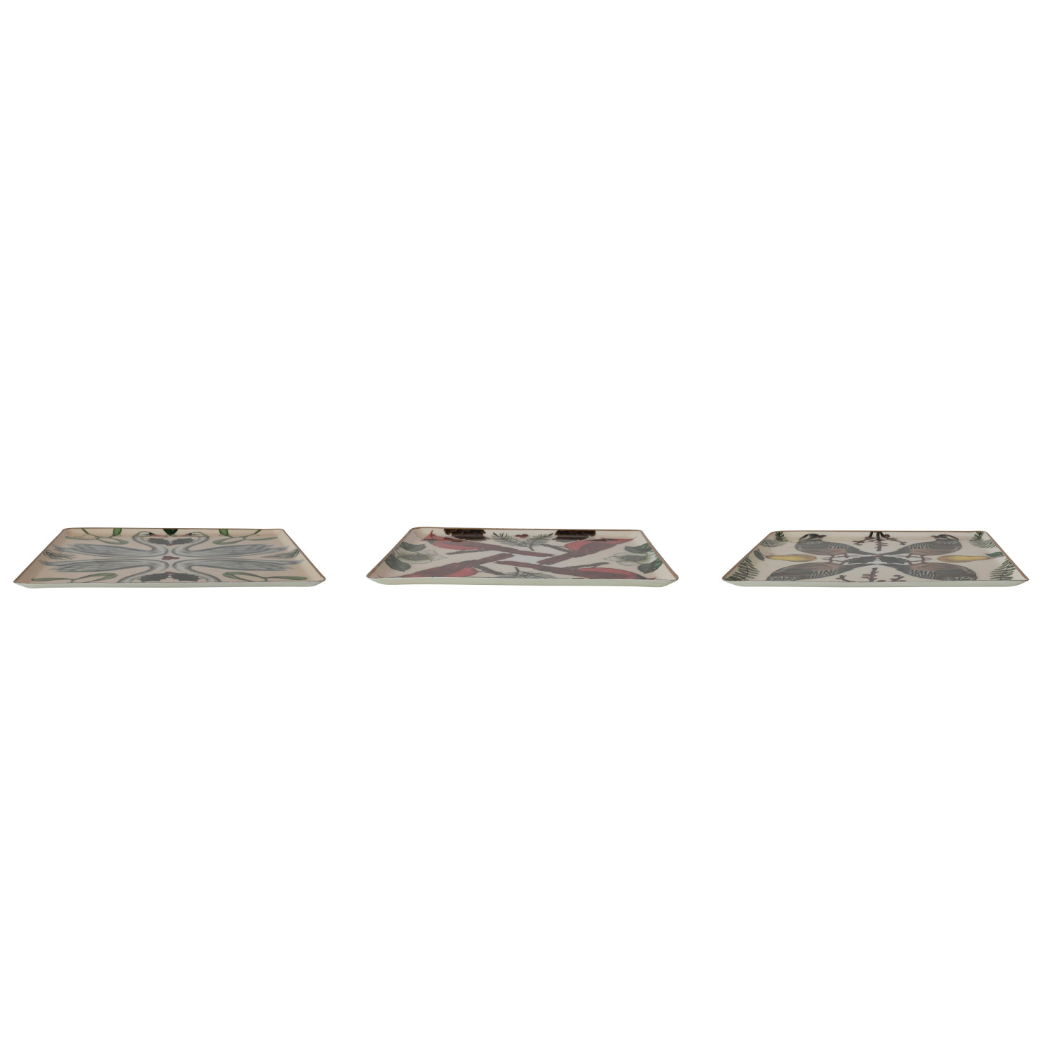 Enameled Metal Trays with Seasonal Botanicals, Birds & Gold Edges, Set of 3 ©