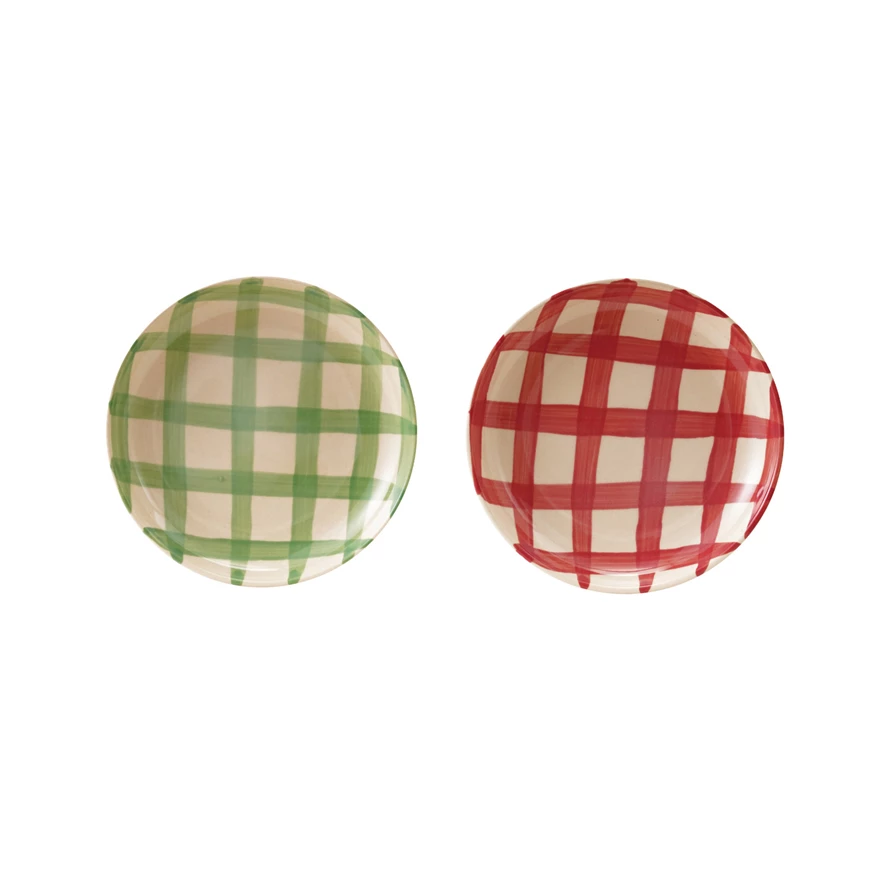 Catalog Name: 5" Round Hand-Painted Stoneware Dish w/ Plaid Pattern, 2 Colors (Each One Will Vary)