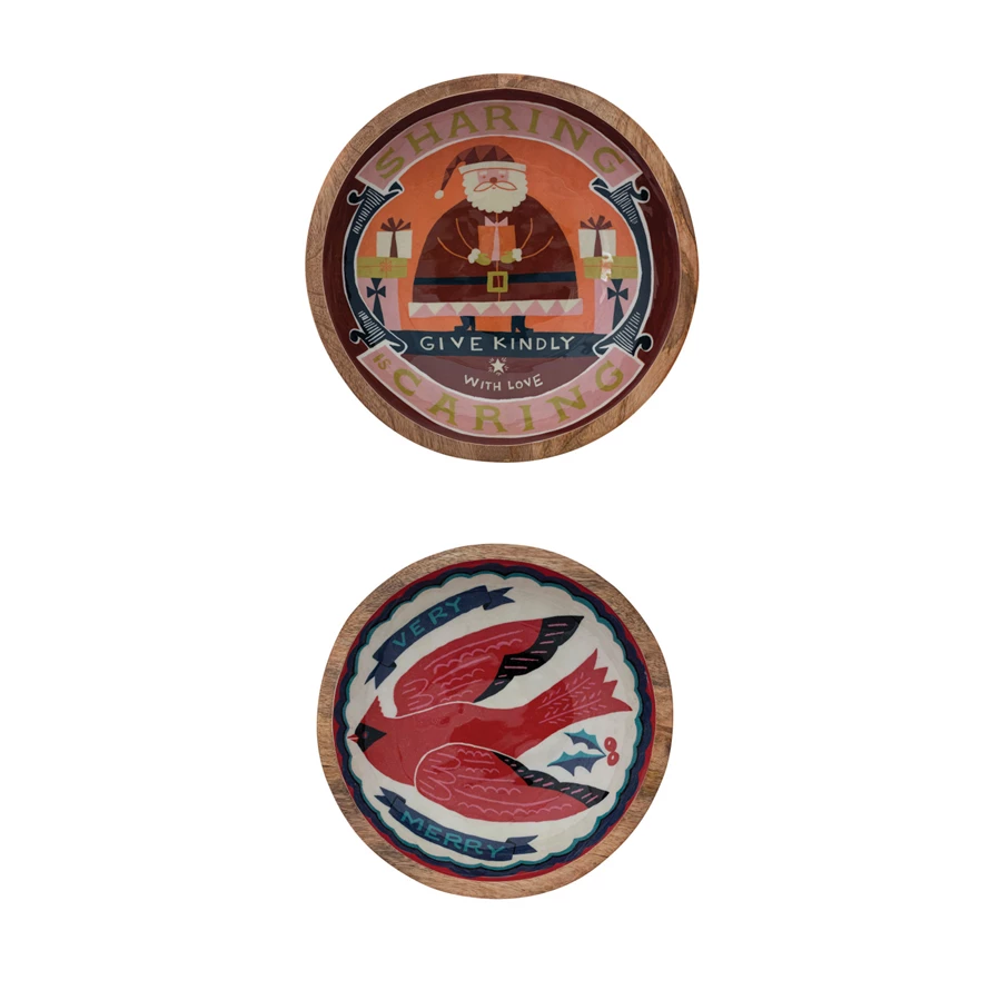 Enameled Mango Wood Bowls with Holiday Image & Saying, Set of 2 ©