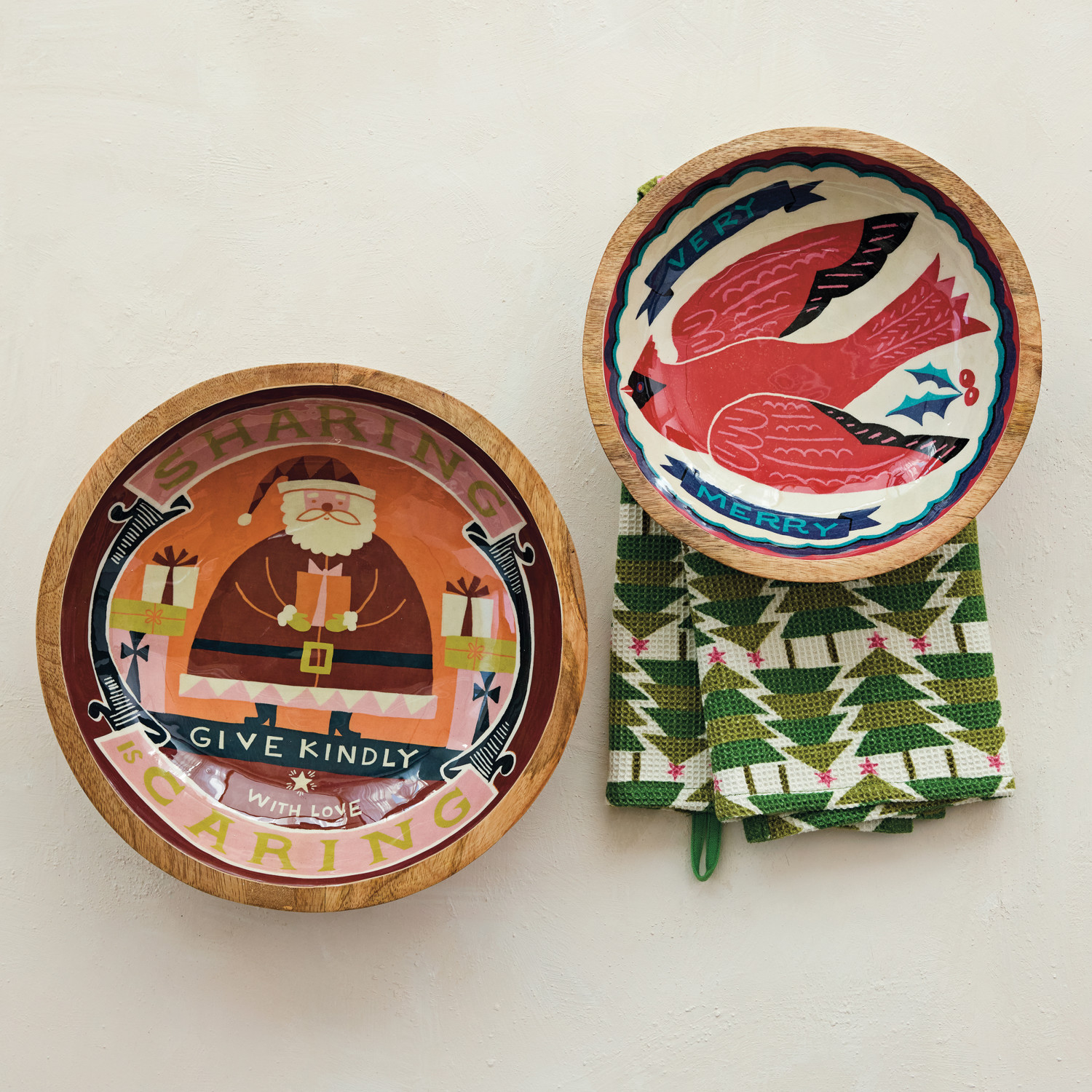 Enameled Mango Wood Bowls with Holiday Image & Saying, Set of 2 ©