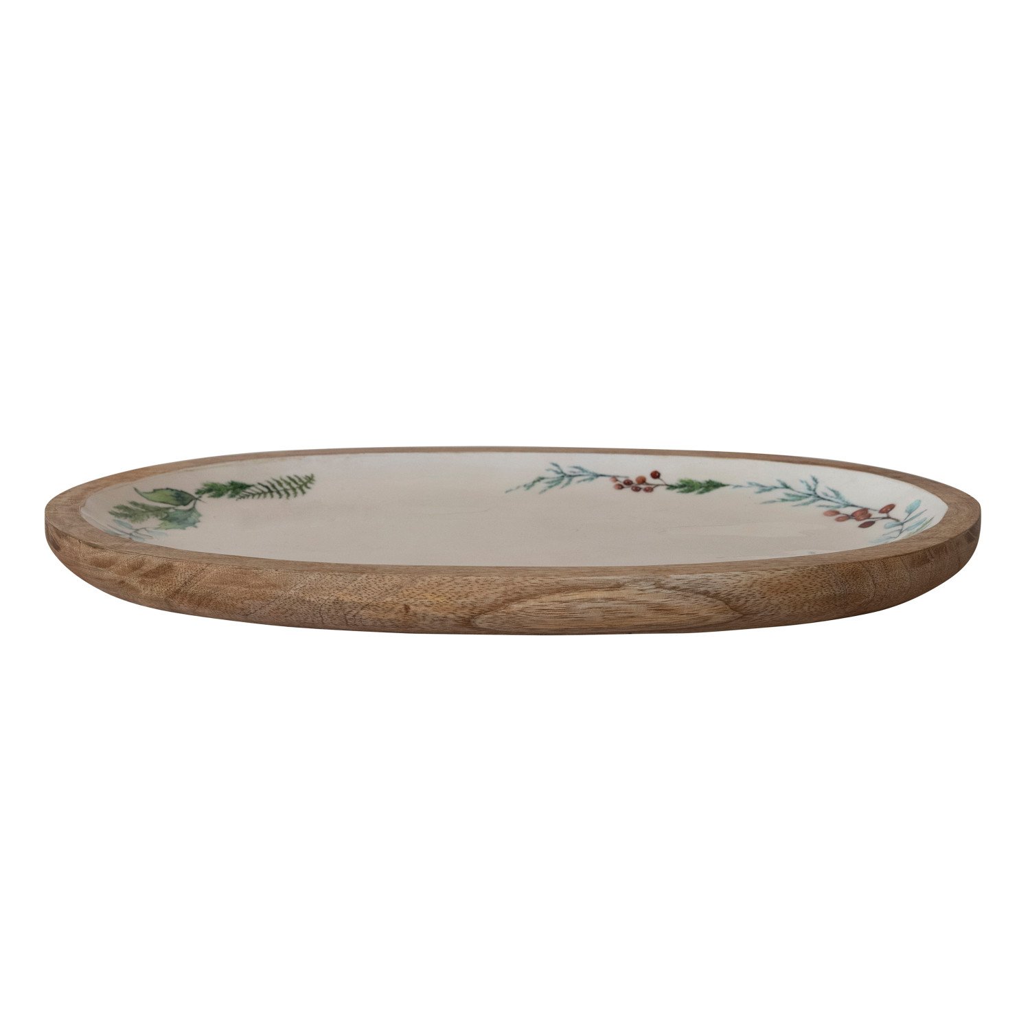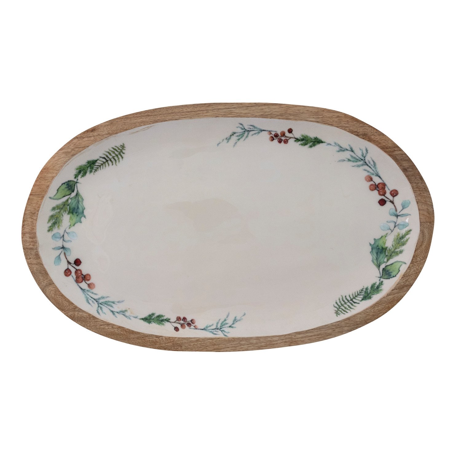 Catalog Name: 18"L x 11"W Oval Enameled Mango Wood Tray w/ Seasonal Botanicals Border, Multi Color ©