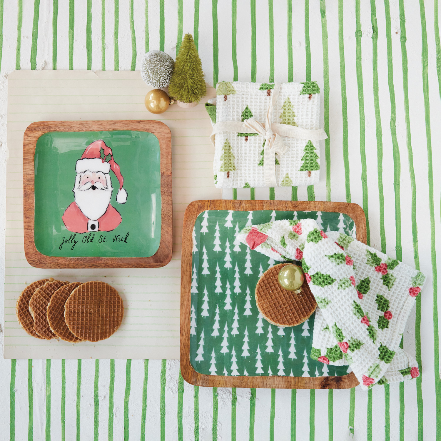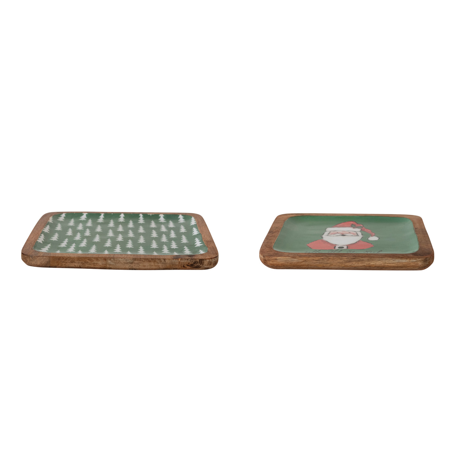 Catalog Name: 10" Square & 8" Square Enameled Mango Wood Trays w/ Santa/Tree Pattern "Jolly Old St. Nick", Multi Color & Natural, Set of 2 ©