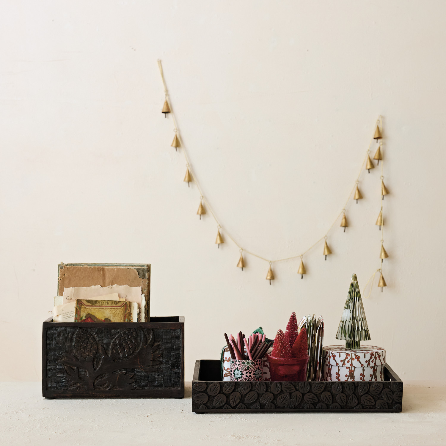 Catalog Name: 11"L x 5-1/4"W x 5-3/4"H Hand-Carved Mango Wood Tray w/ Leaves & Handles, Espresso Finish