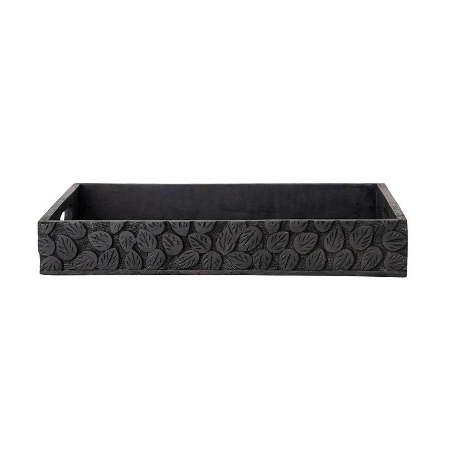 Catalog Name: 11"L x 5-1/4"W x 5-3/4"H Hand-Carved Mango Wood Tray w/ Leaves & Handles, Espresso Finish
