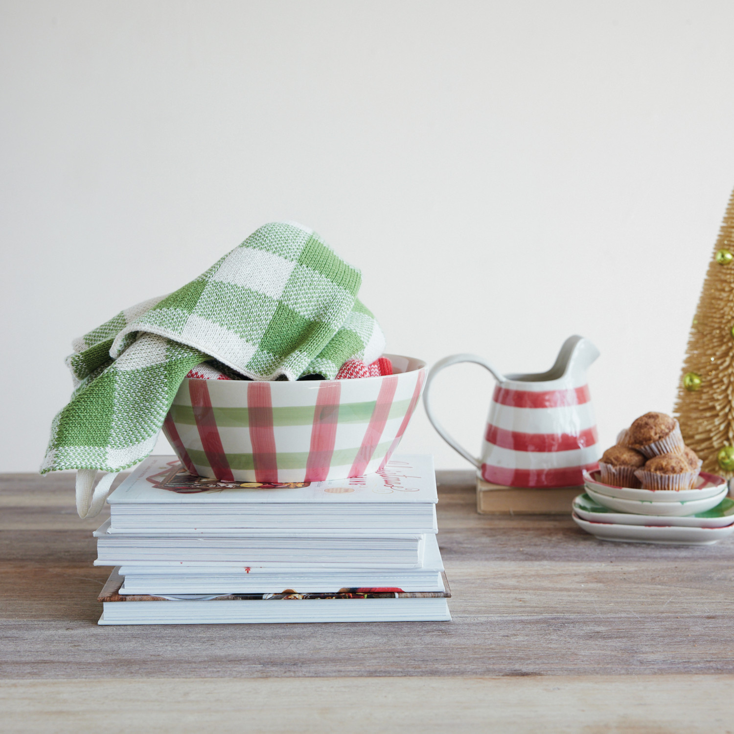 Catalog Name: 9-1/4" Round x 3"H Hand-Painted Stoneware Bowl w/ Plaid Pattern, Red, Green & White (Each One Will Vary)