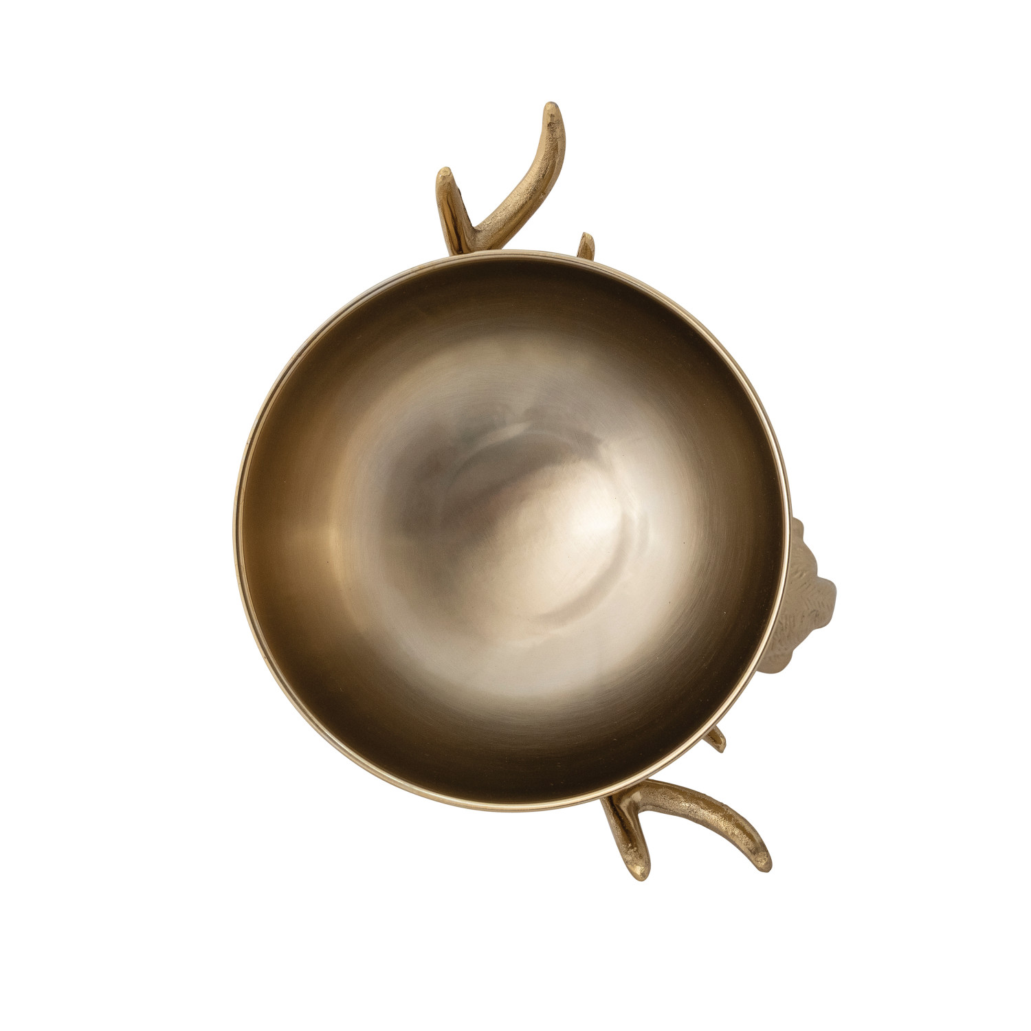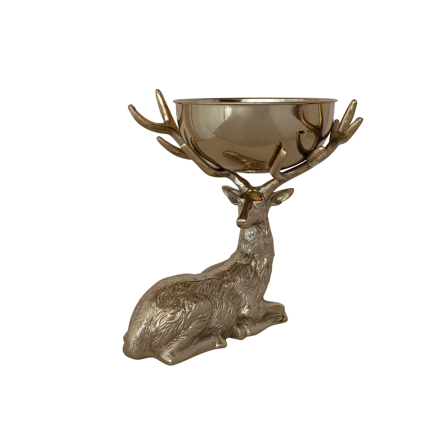 Catalog Name: 16"L x 12"W x 15"H Cast Aluminum Reindeer w/ Antlers Holding 10-1/4" Round x 4-1/2"H Removable Bowl, Gold Finish, Set of 2, Truck Ship