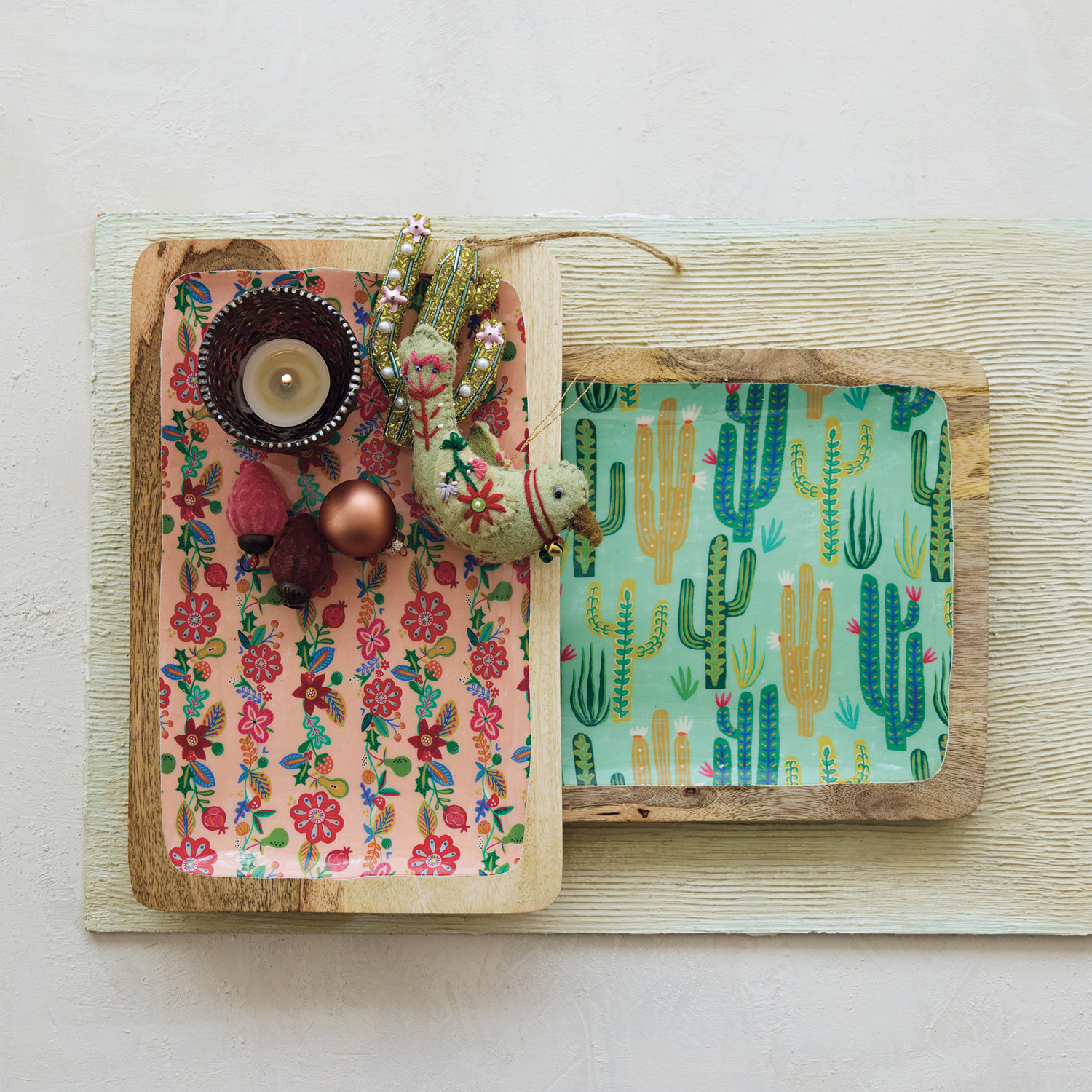 Enameled Mango Wood Trays with Cacti & Seasonal Botanicals Patterns, Set of 2 ©