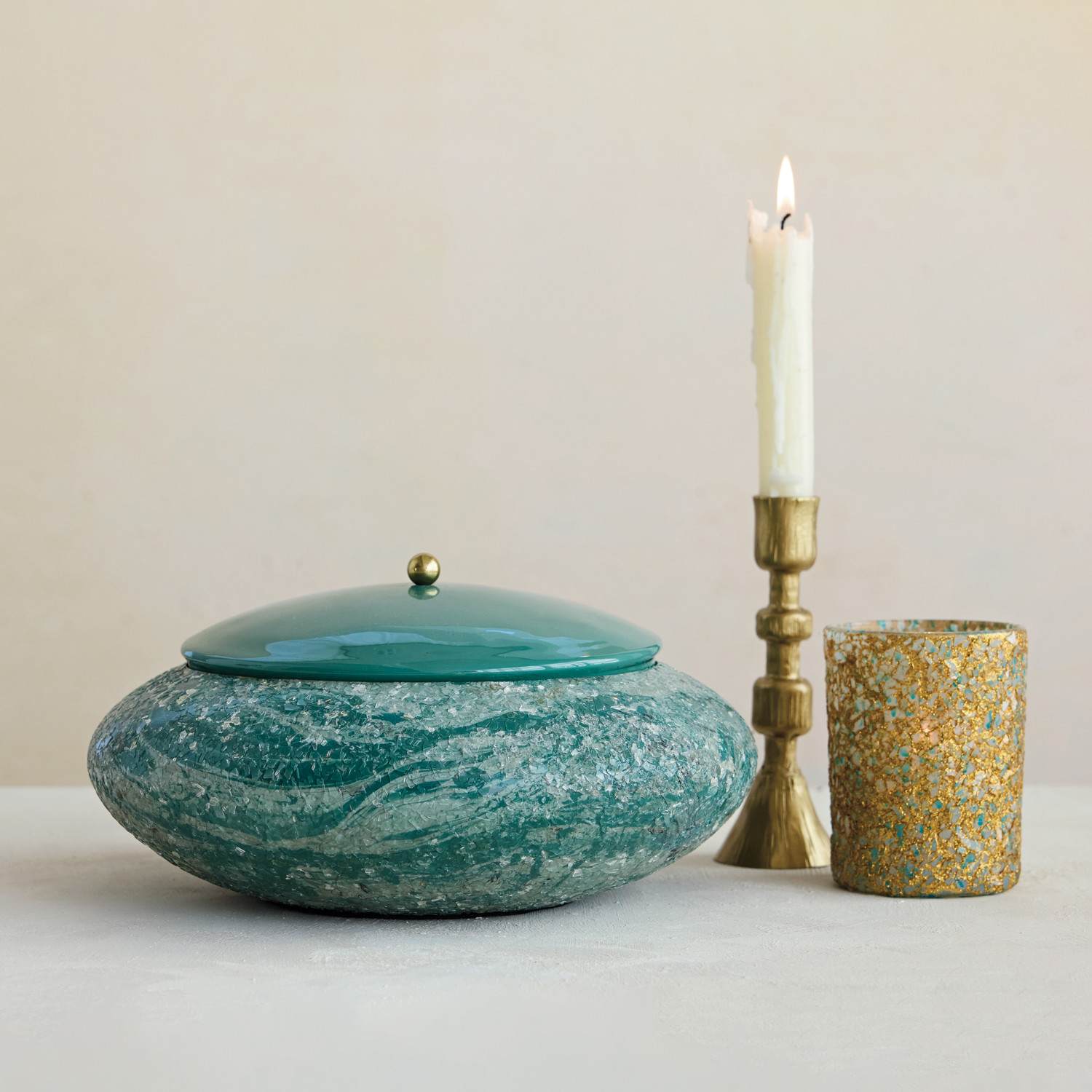 Decorative Metal Box with Mica Flakes, Enameled Lid, Interior Knob, Marbled Green