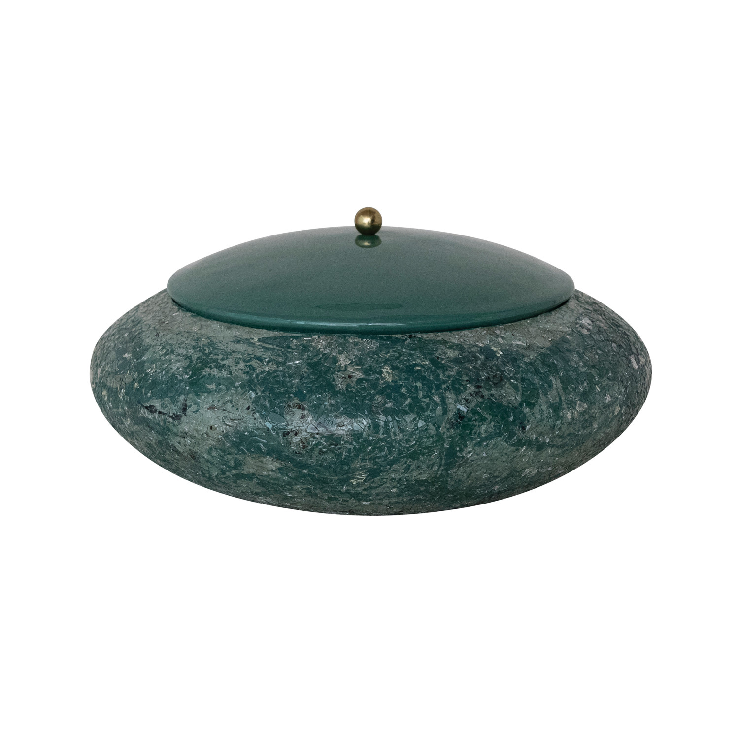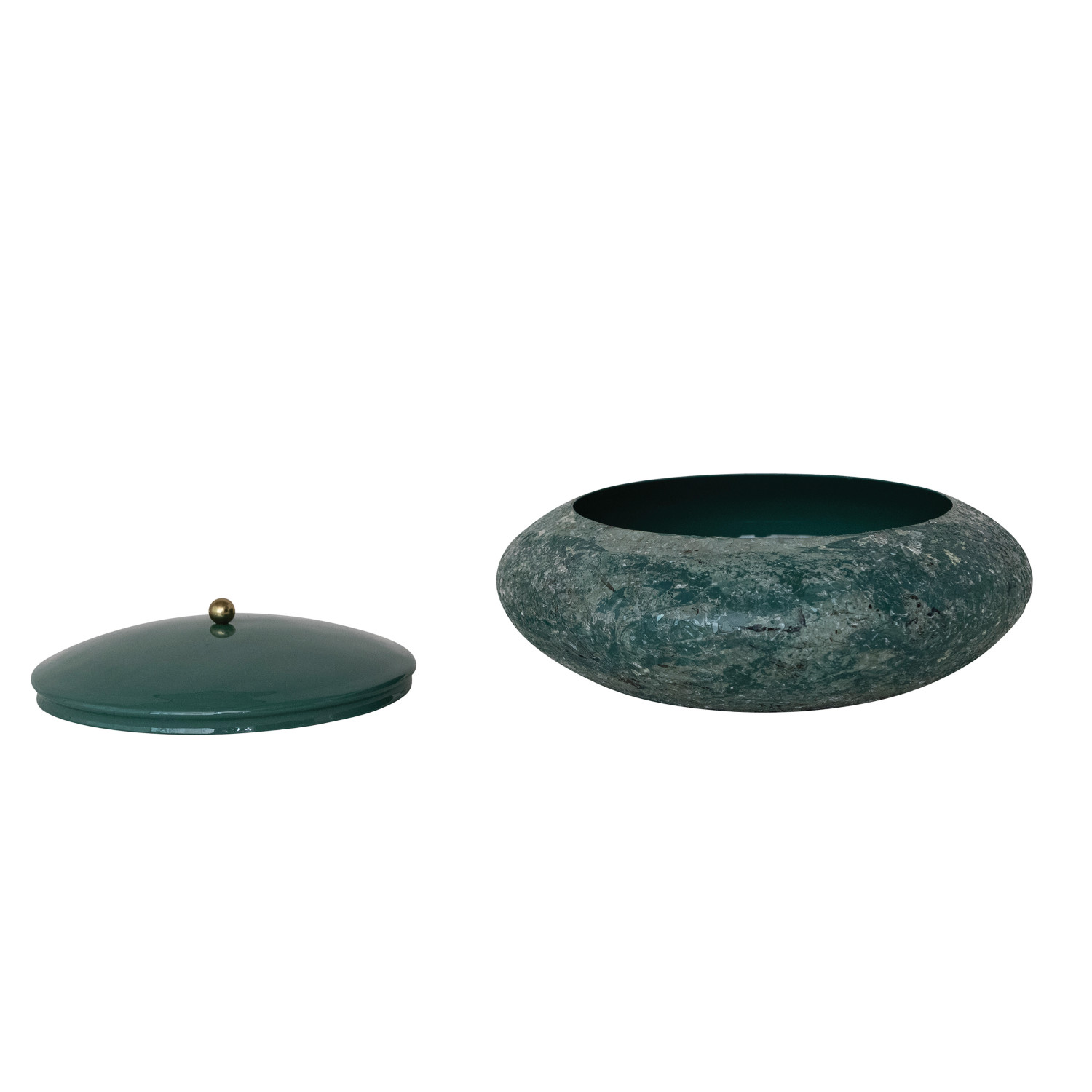 Catalog Name: 10" Round x 4-3/4"H Decorative Metal Box w/ Mica Flakes, Enameled Lid, Interior & Gold Finish Knob, Marbled Green