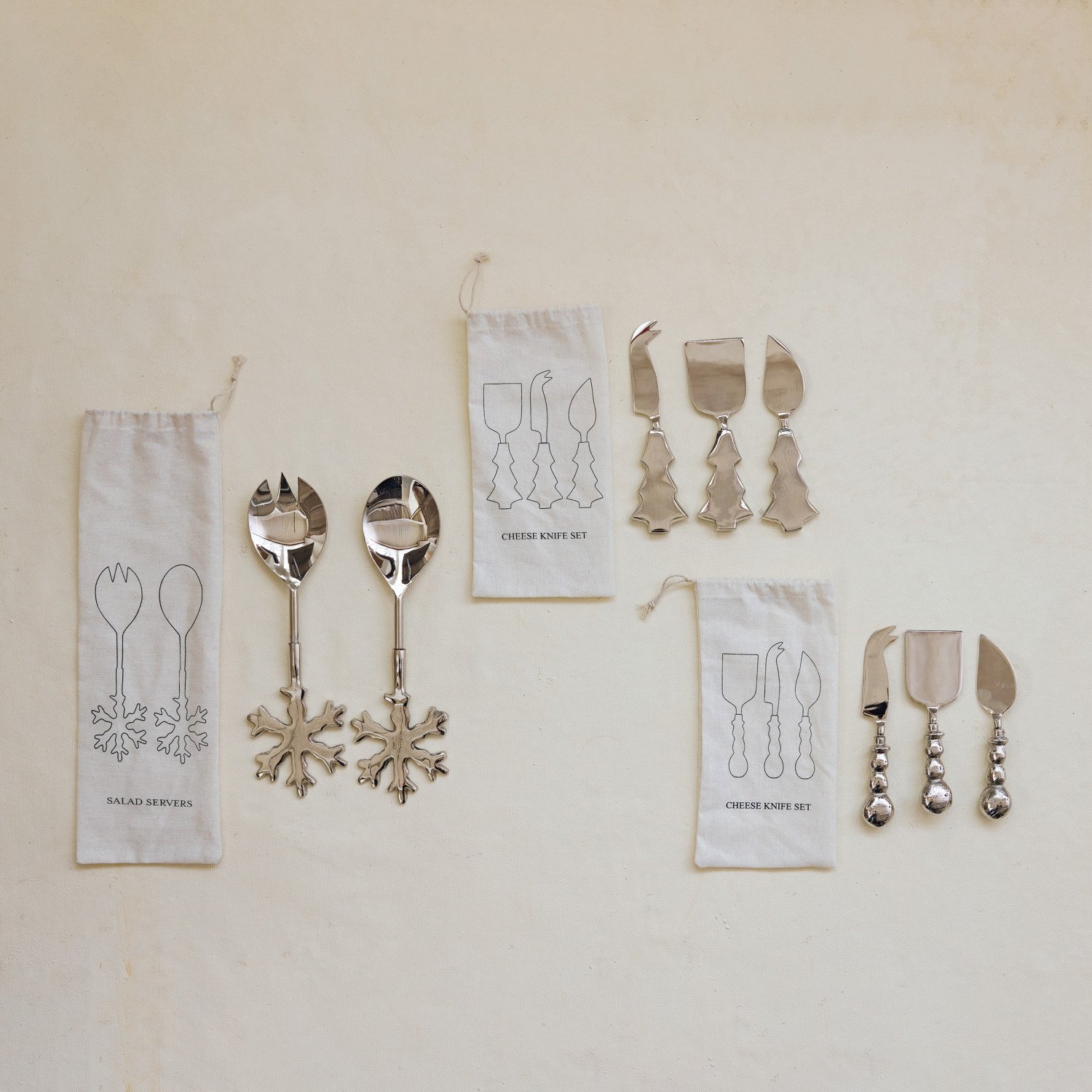 Catalog Name: 6-1/4"L Stainless Steel & Aluminum Cheese Knives w/ Snowman Shaped Handles, Nickel Finish, Set of 3 in Printed Drawstring Bag