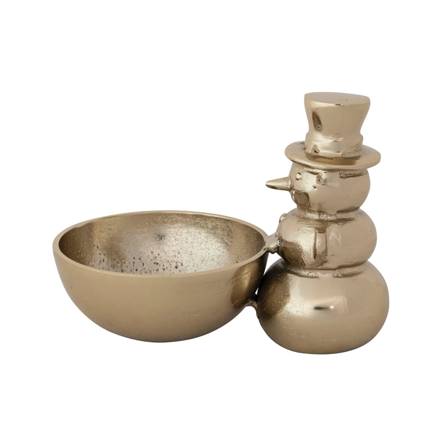 Catalog Name: 7-1/2"L x 5"W x 5-1/2"H Cast Aluminum Snowman Holding Bowl, Gold Finish