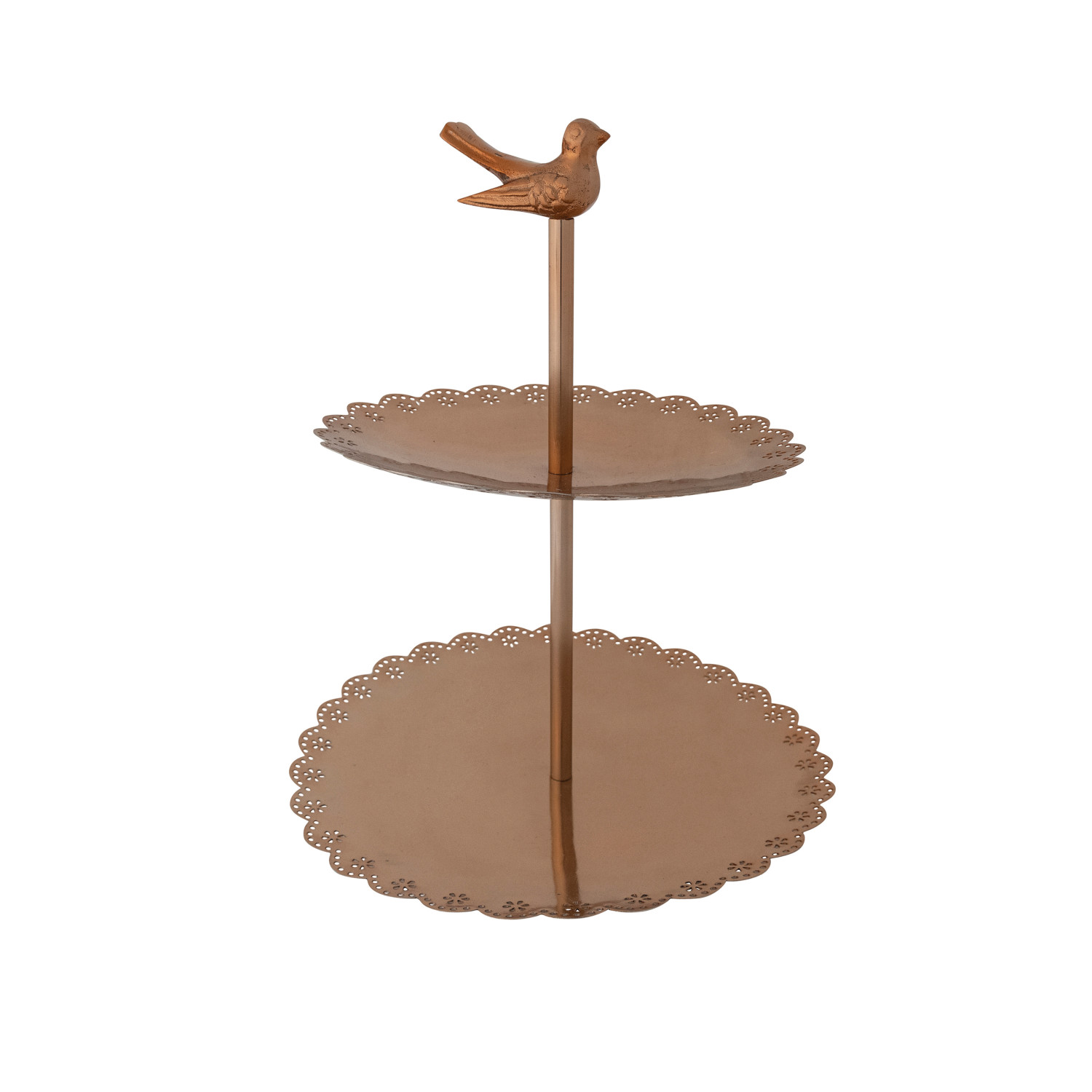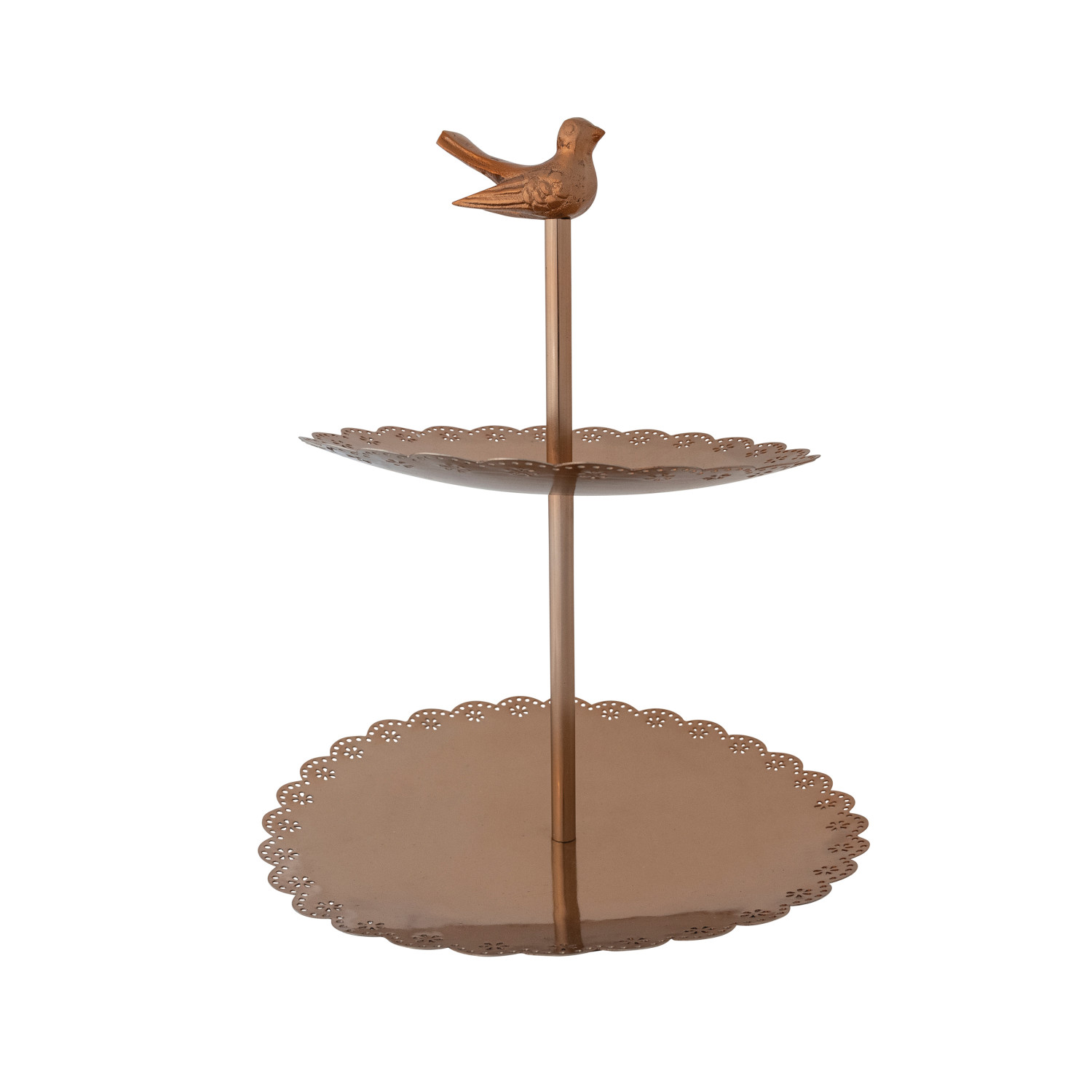 Catalog Name: 12" Round x 15-1/4"H Metal Scalloped 2-Tier Tray w/ Floral Cut-Outs & Bird Shaped Handle, Copper Finish, KD