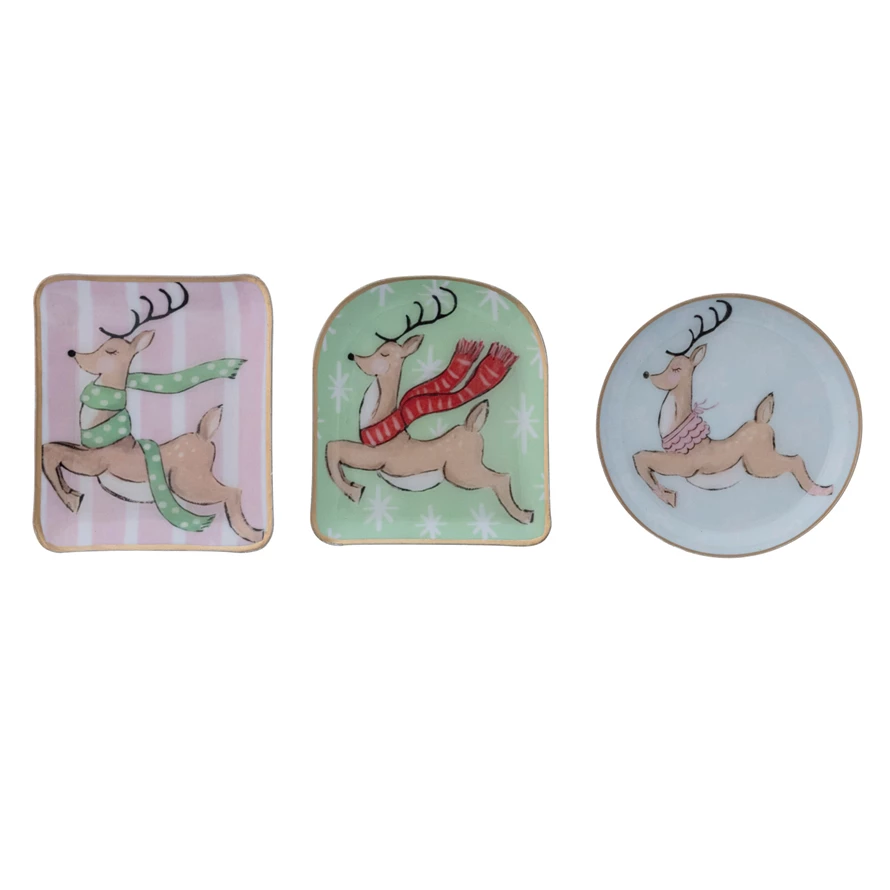 Catalog Name: Approximately 4"L Enameled Metal Dish w/ Reindeer in Scarf & Gold Edge, Multi Color, 3 Styles ©