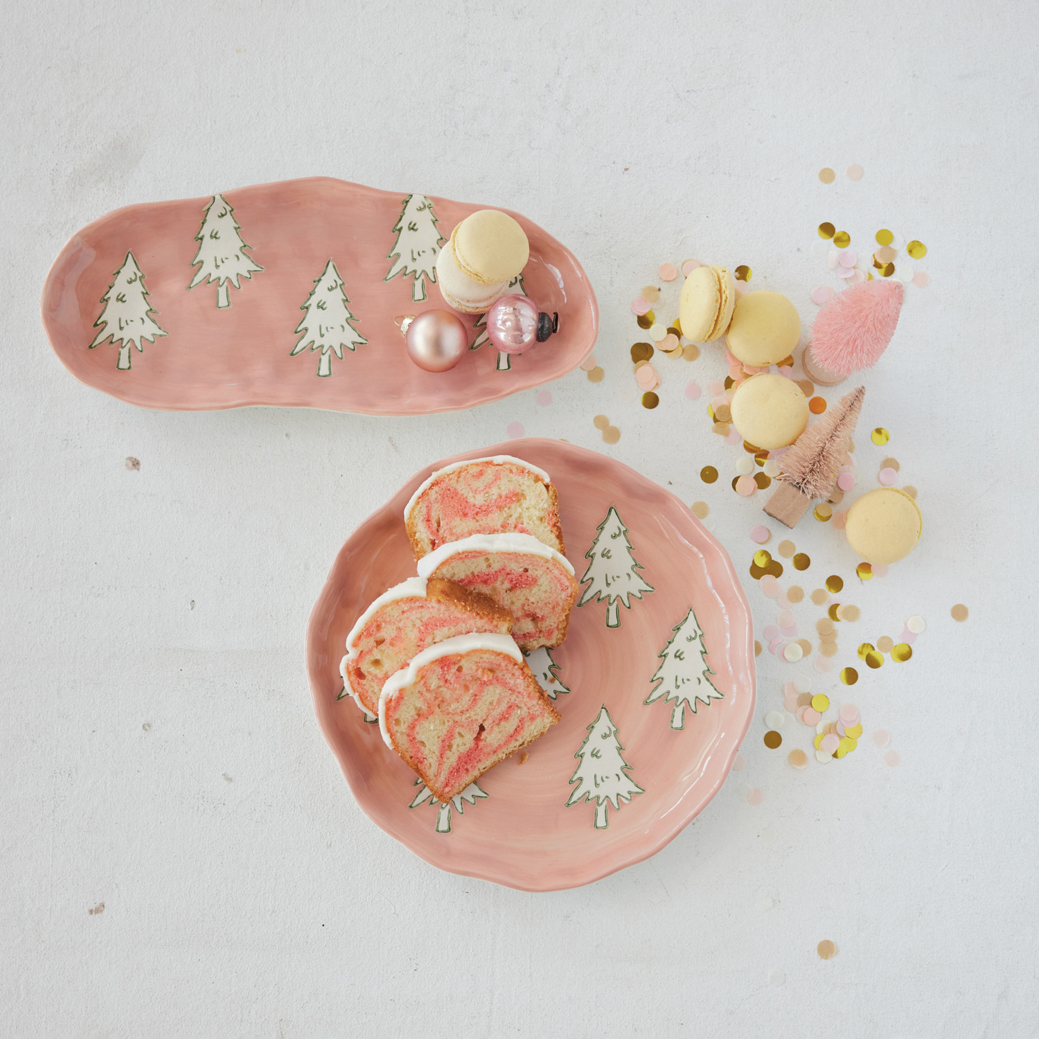 Stoneware Organic Shaped Platter with Wax Relief Trees, Pink, White & Green