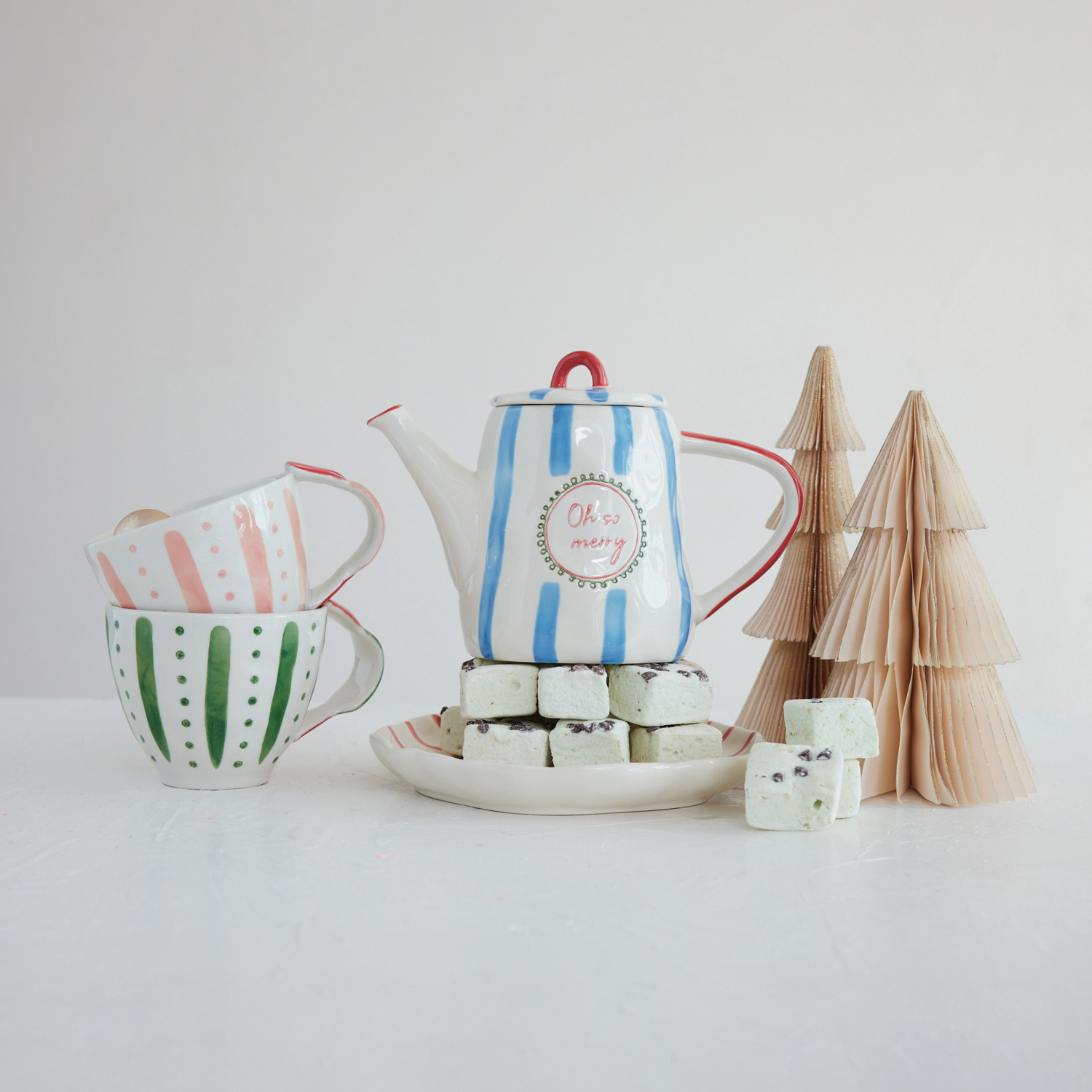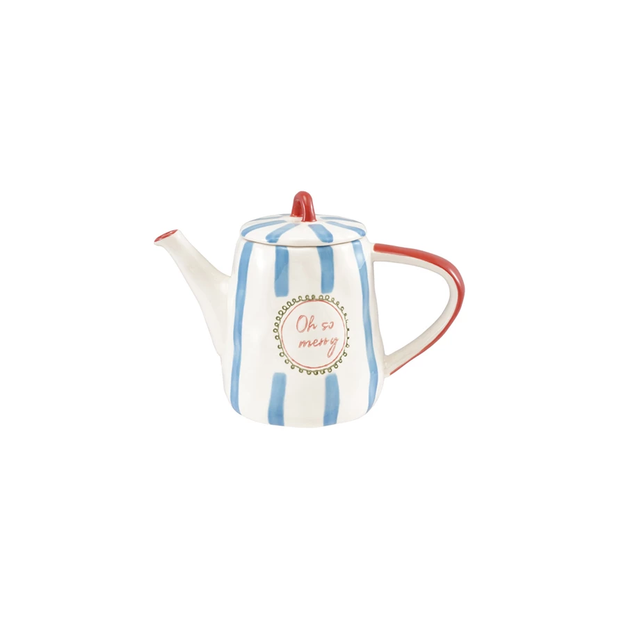 28 oz. Stoneware Striped Teapot "Oh So Merry", White, Blue & Red