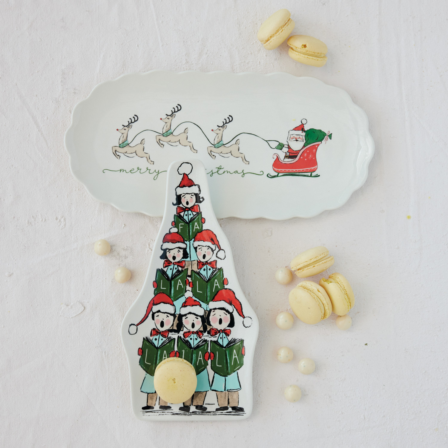 Catalog Name: 12"L x 6"W Stoneware Scalloped Platter w/ Santa's Sleigh & Reindeer "Merry Christmas", Multi Color ©