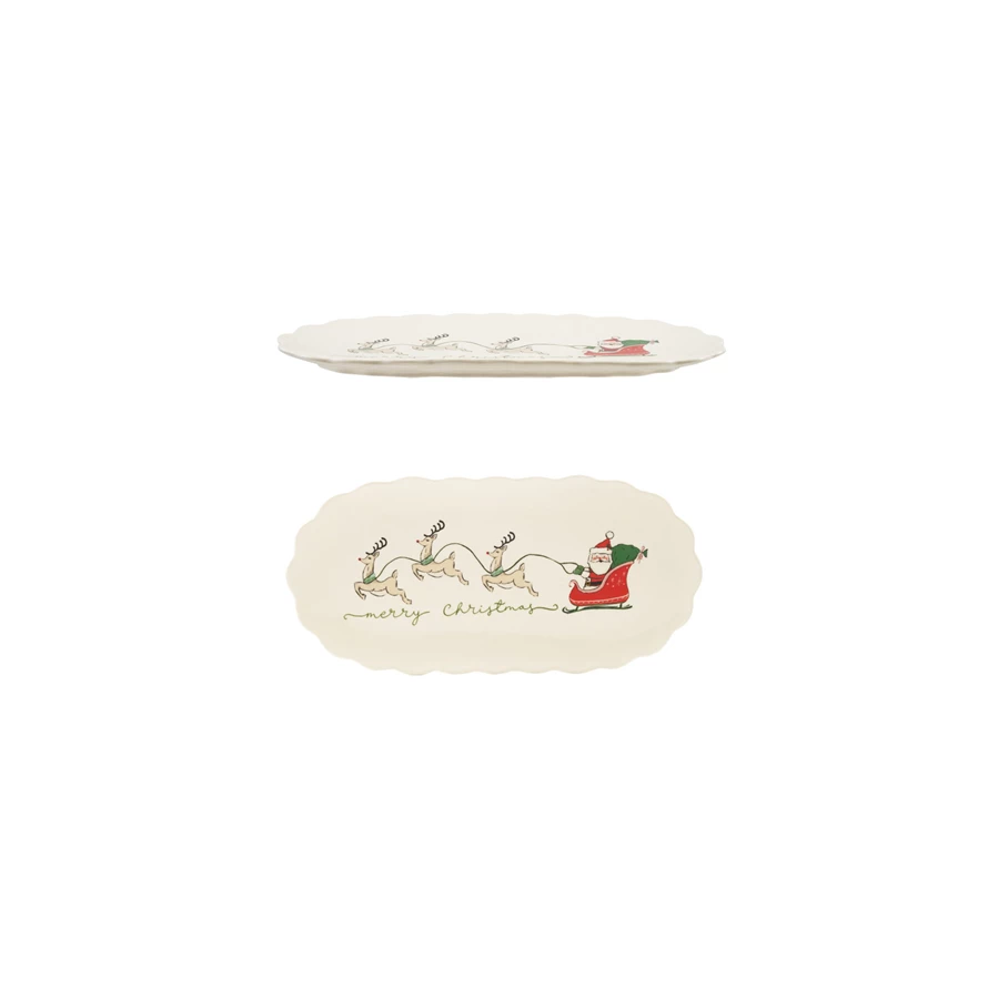 Stoneware Scalloped Platter with Santa's Sleigh & Reindeer "Merry Christmas" ©