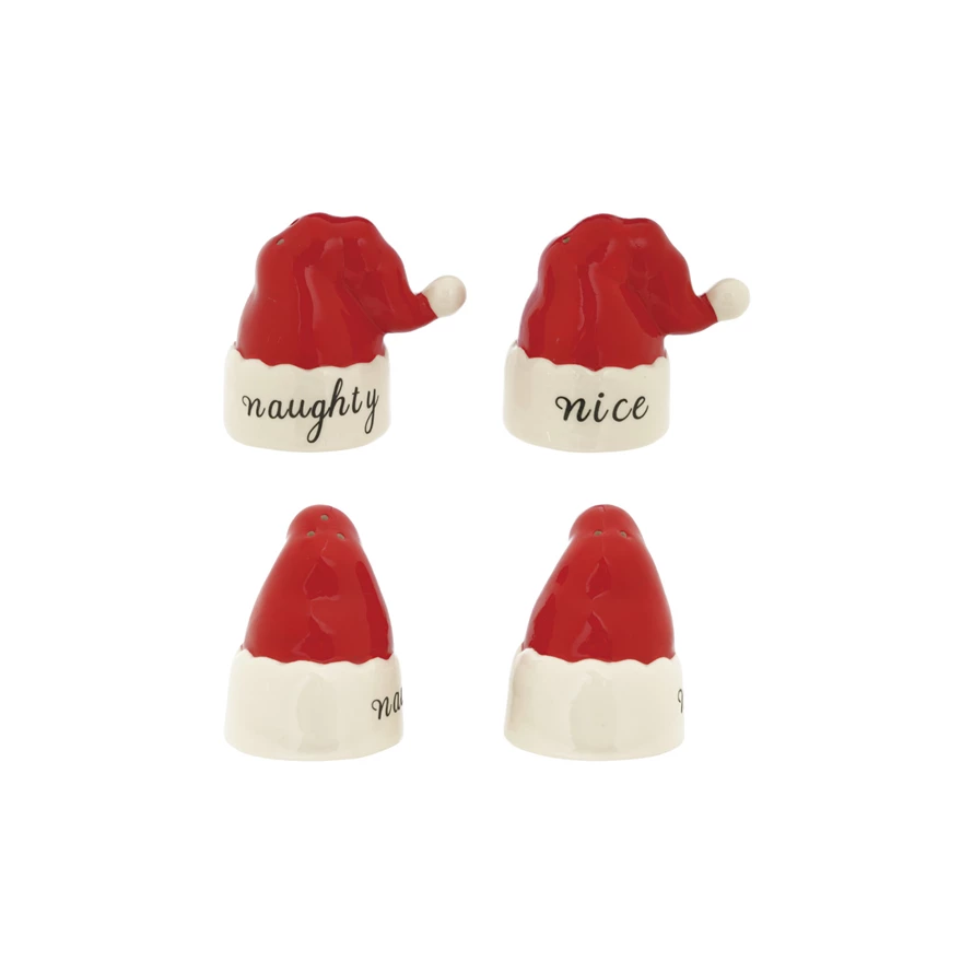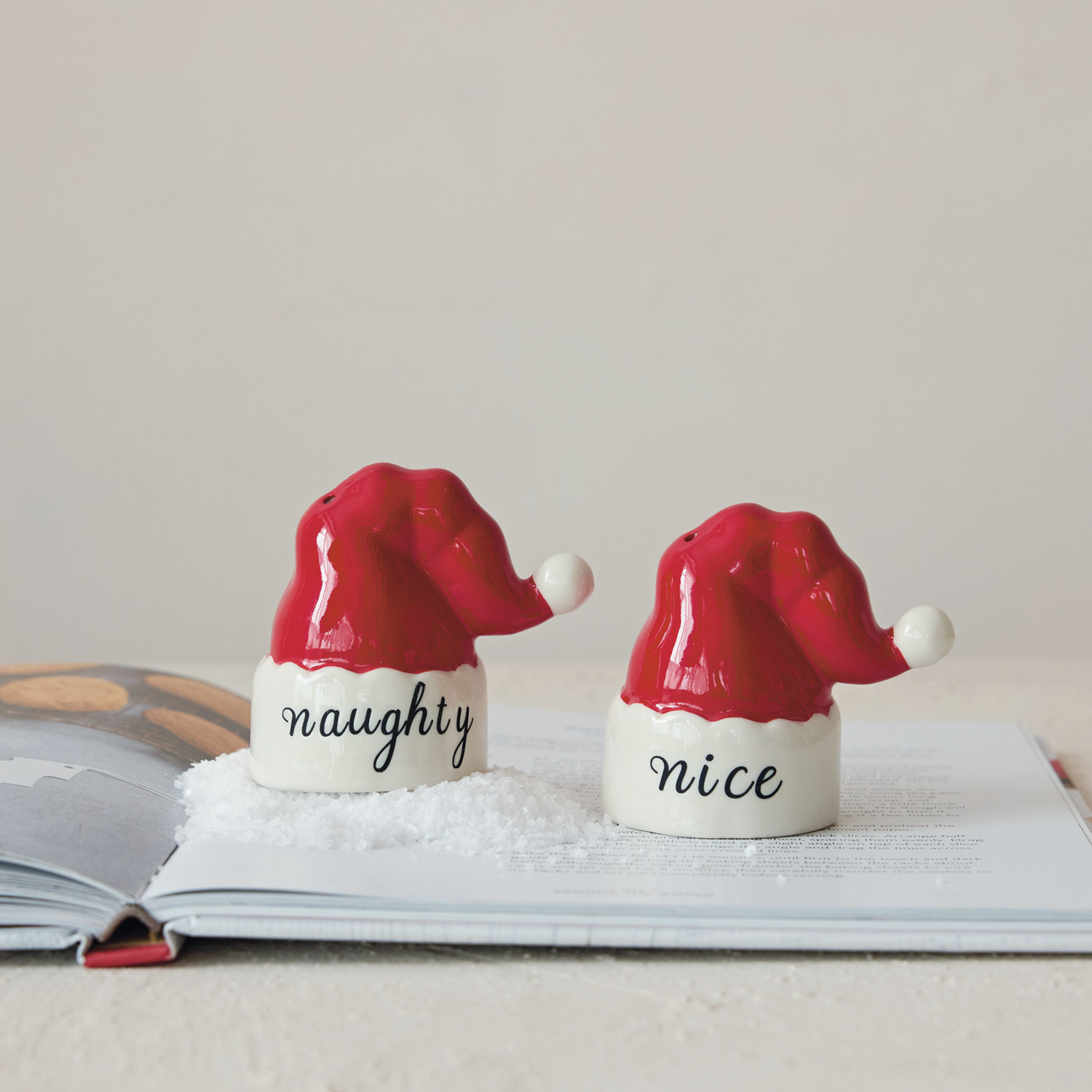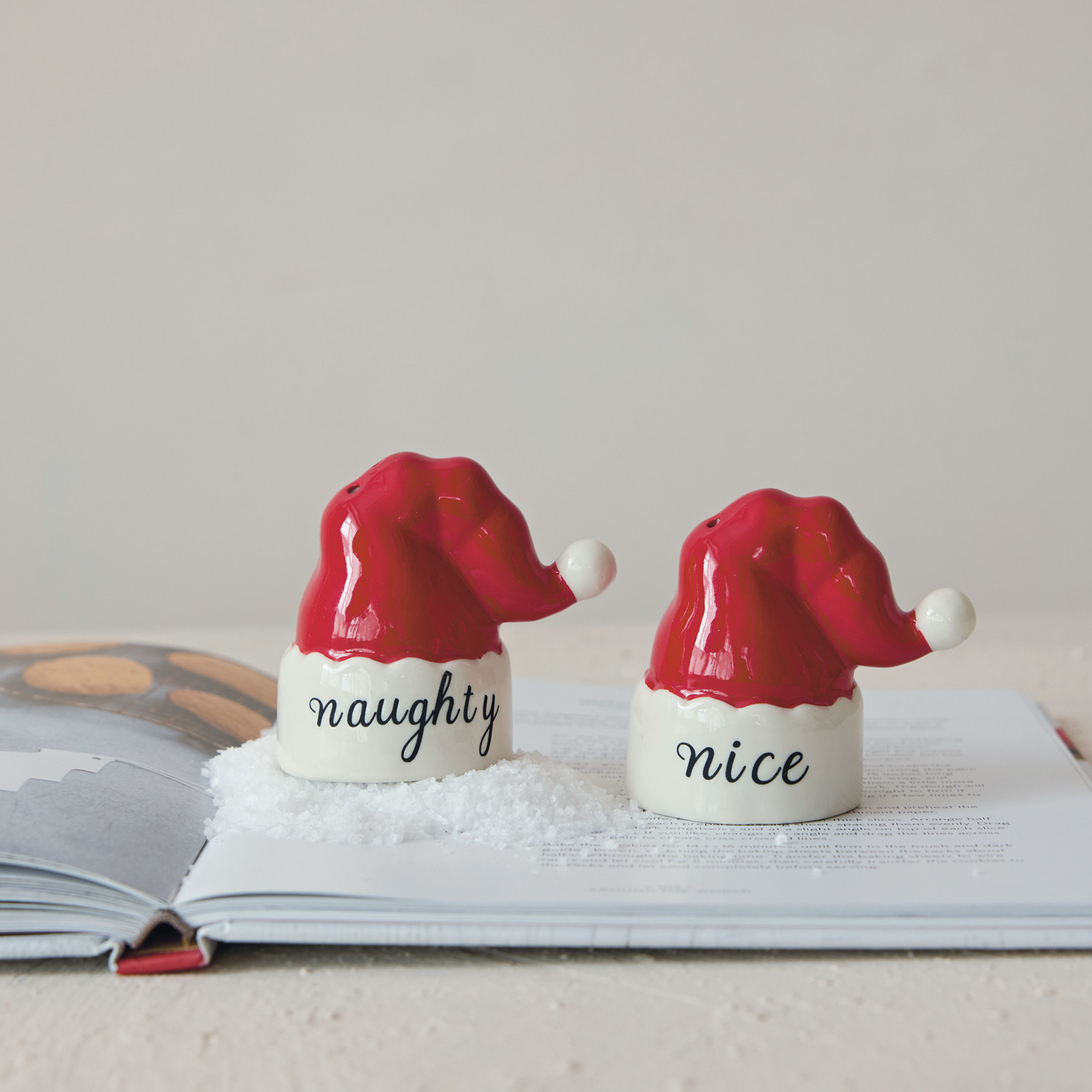 Catalog Name: 2-1/2"H Hand-Painted Stoneware Santa Hat Shaped Salt & Pepper Shakers "Naughty/Nice", Red, White & Black, Set of 2
