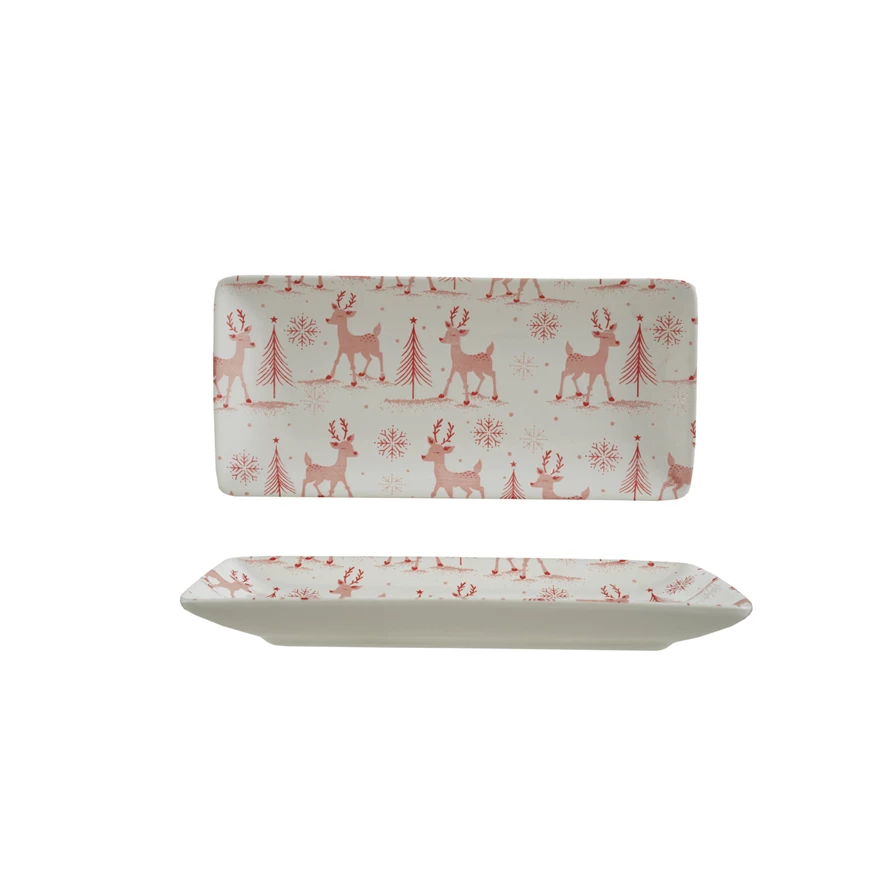 Catalog Name: 9-1/2"L x 4-1/4"W Stoneware Platter w/ Reindeer, Trees & Snowflakes Pattern, White & Pink
