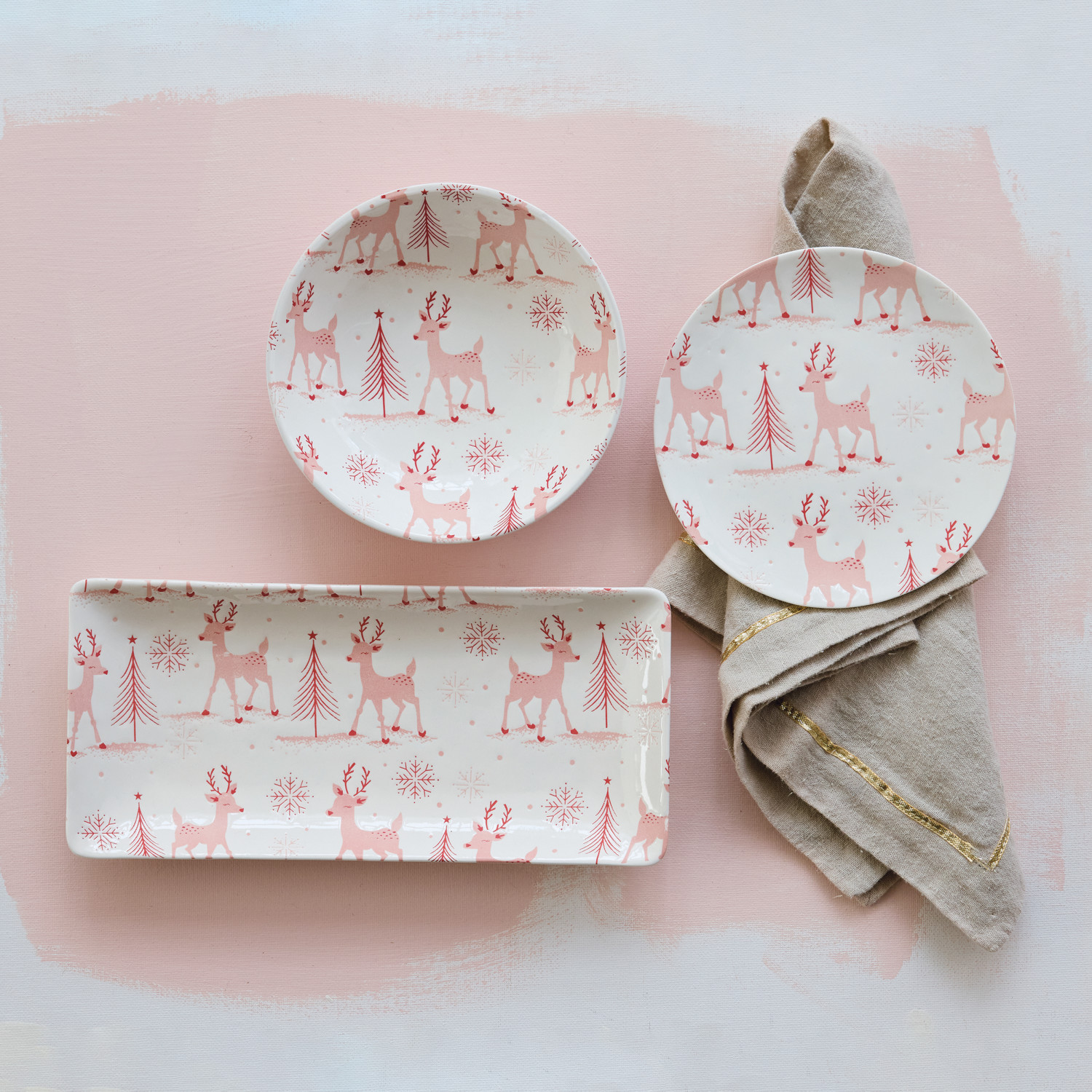 Stoneware Platter with Reindeer, Trees & Snowflakes Pattern, White & Pink