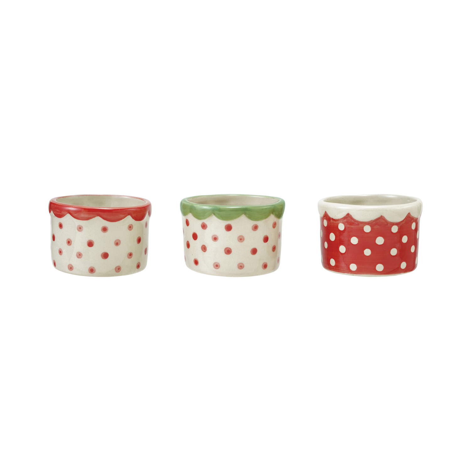 Catalog Name: 3" Round x 2"H Hand-Painted Stoneware Container w/ Polka Dots & Scalloped Rim, 3 Colors