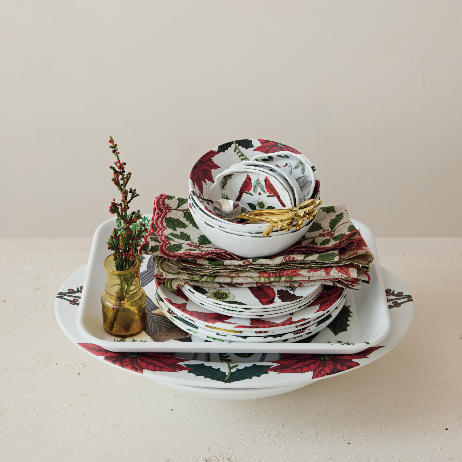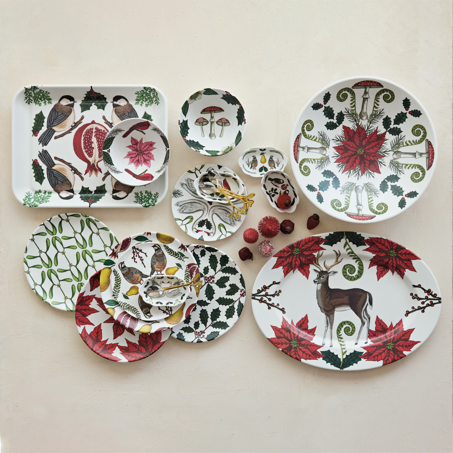 Melamine Scalloped Dish with Seasonal Botanicals & Animals, Matte Finish, 4 Styles ©