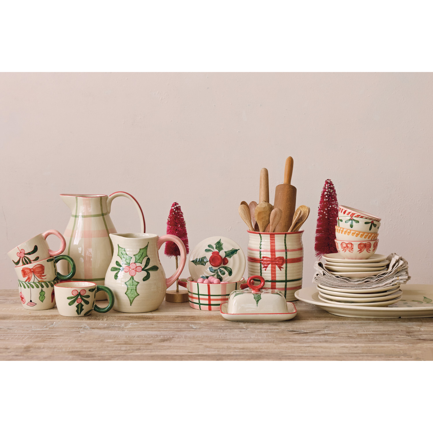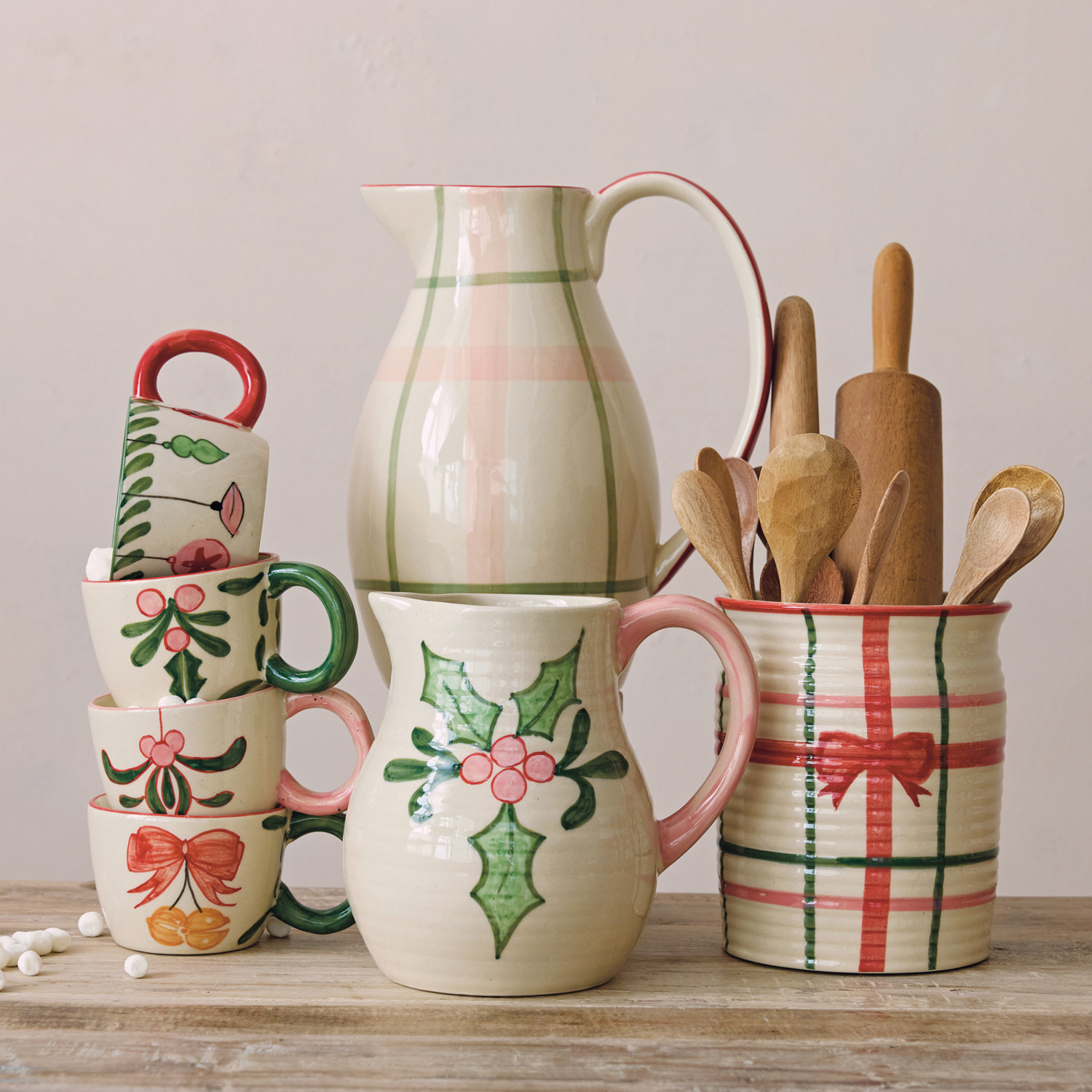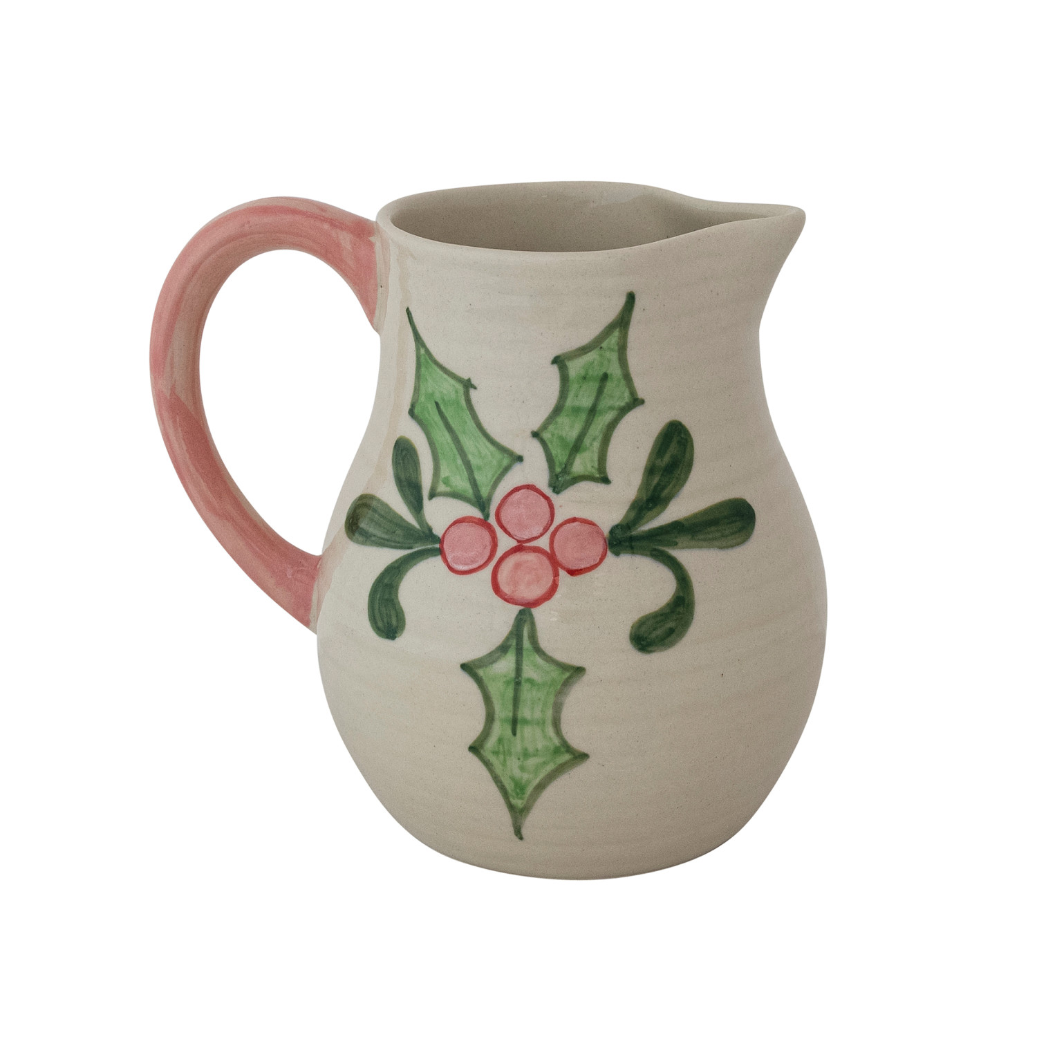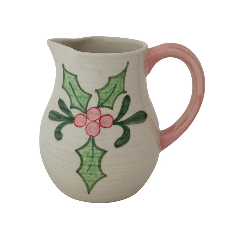 Catalog Name: 8"L x 6"W x 7-1/4"H 1-3/4 Quart Hand-Painted Stoneware Ribbed Pitcher w/ Holiday Botanicals & Colored Handle, Multi Color (Each One Will Vary)