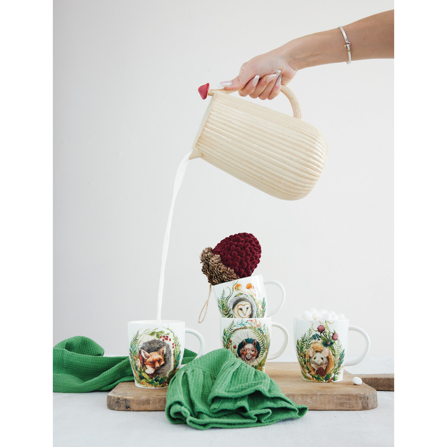Catalog Name: 7-3/4"L x 5-1/2"W x 9-1/2"H 2-1/2 Quart Hand-Painted Ceramic Fluted Pitcher w/ 3D Mushroom Handle, Tan Color & Red