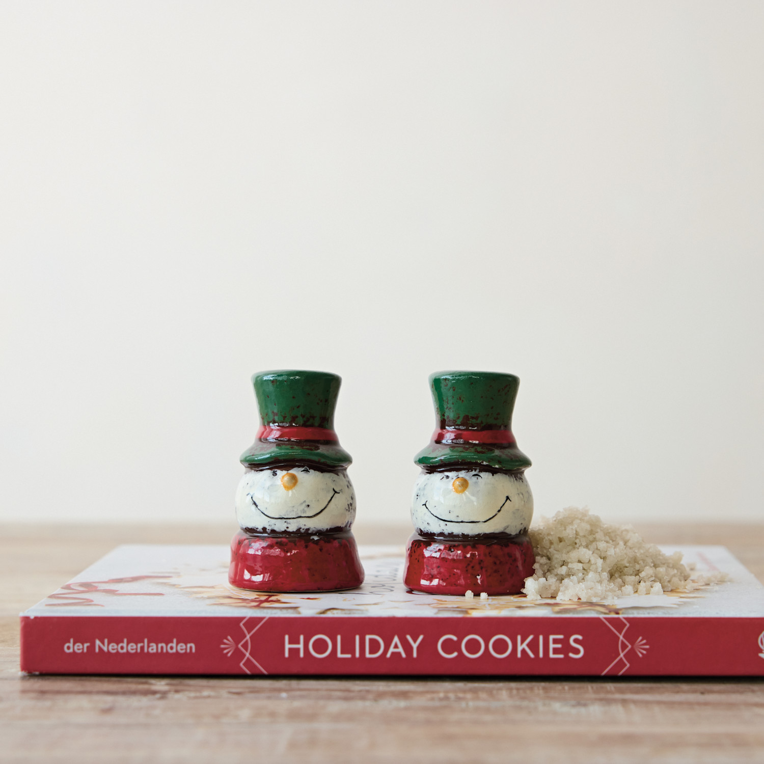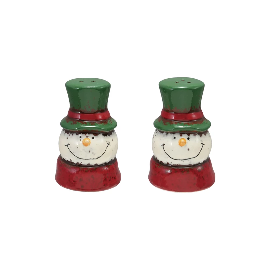 Catalog Name: 2-3/4"H Hand-Painted Ceramic Snowman Head Shaped Salt & Pepper Shakers, Reactive Glaze, Green, Red & White, Set of 2 (Each One Will Vary)