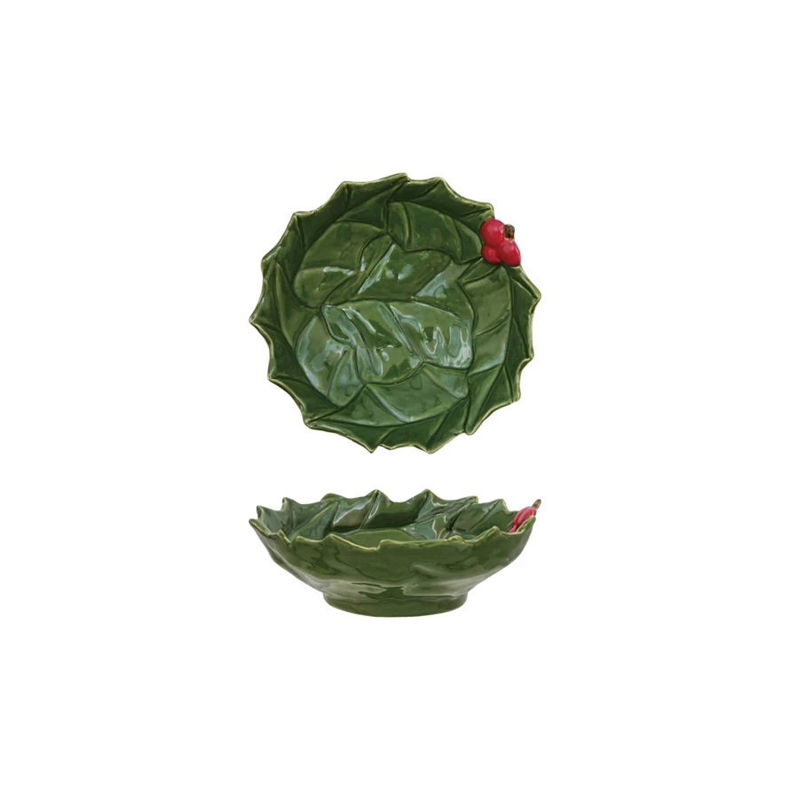 Hand-Painted Holly Leaves Shaped Low Bowl with Berries, Green & Red