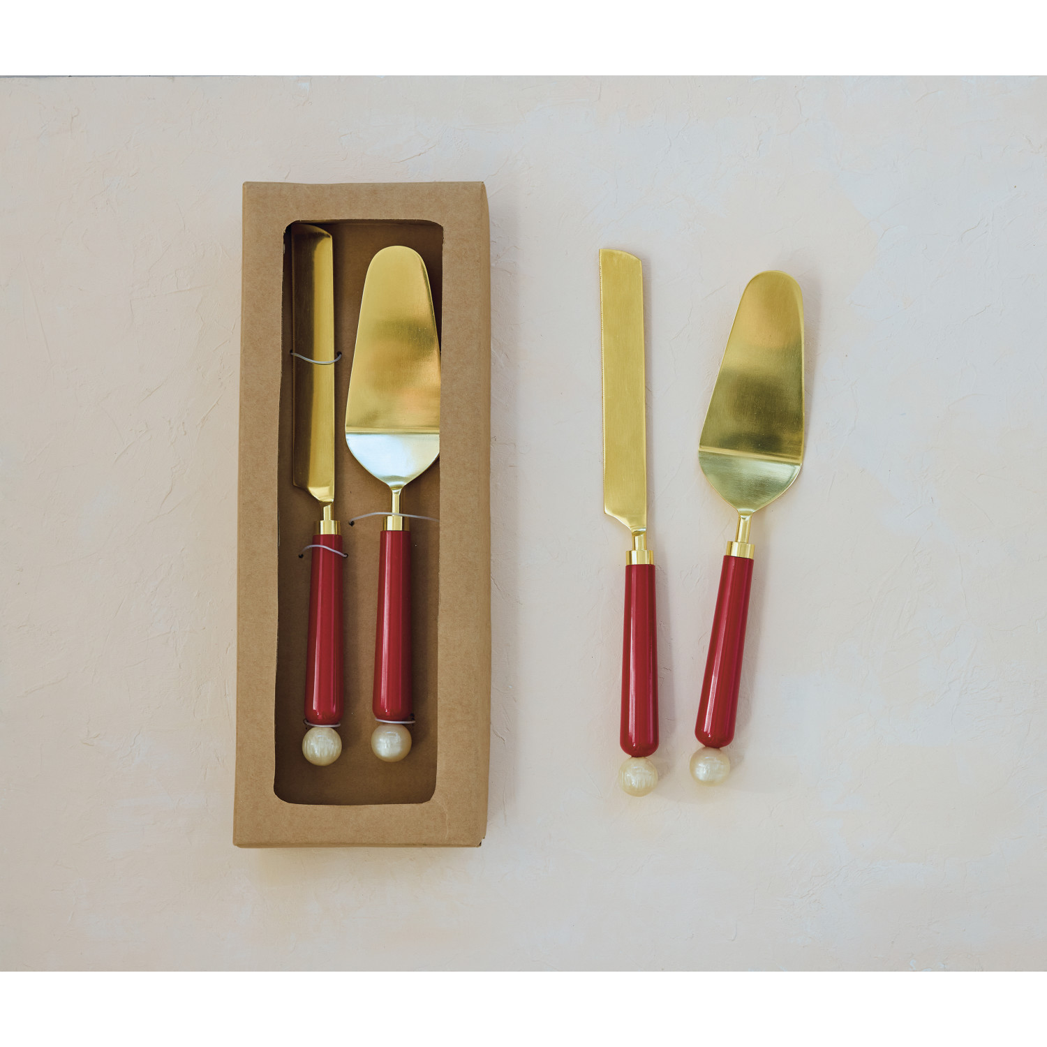 Catalog Name: 11"L Stainless Steel Cake Servers w/ Marbled Resin Handles, Gold Finish, Red & Cream Color, Boxed Set of 2