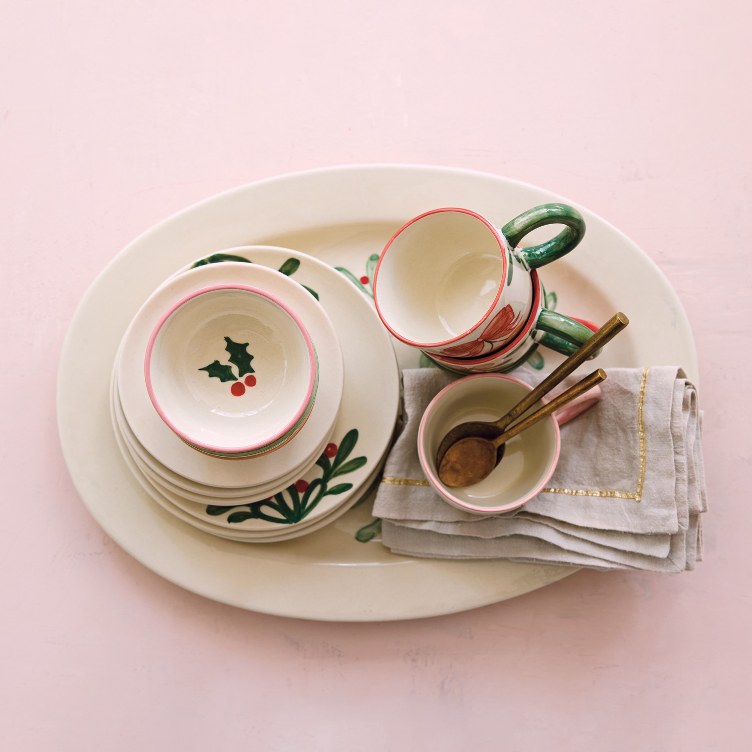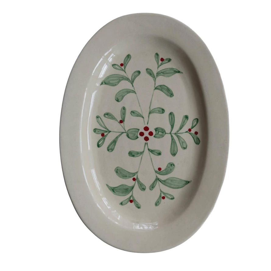 Hand-Painted Stoneware Platter with Mistletoe, Green & Red (Each One Will Vary)