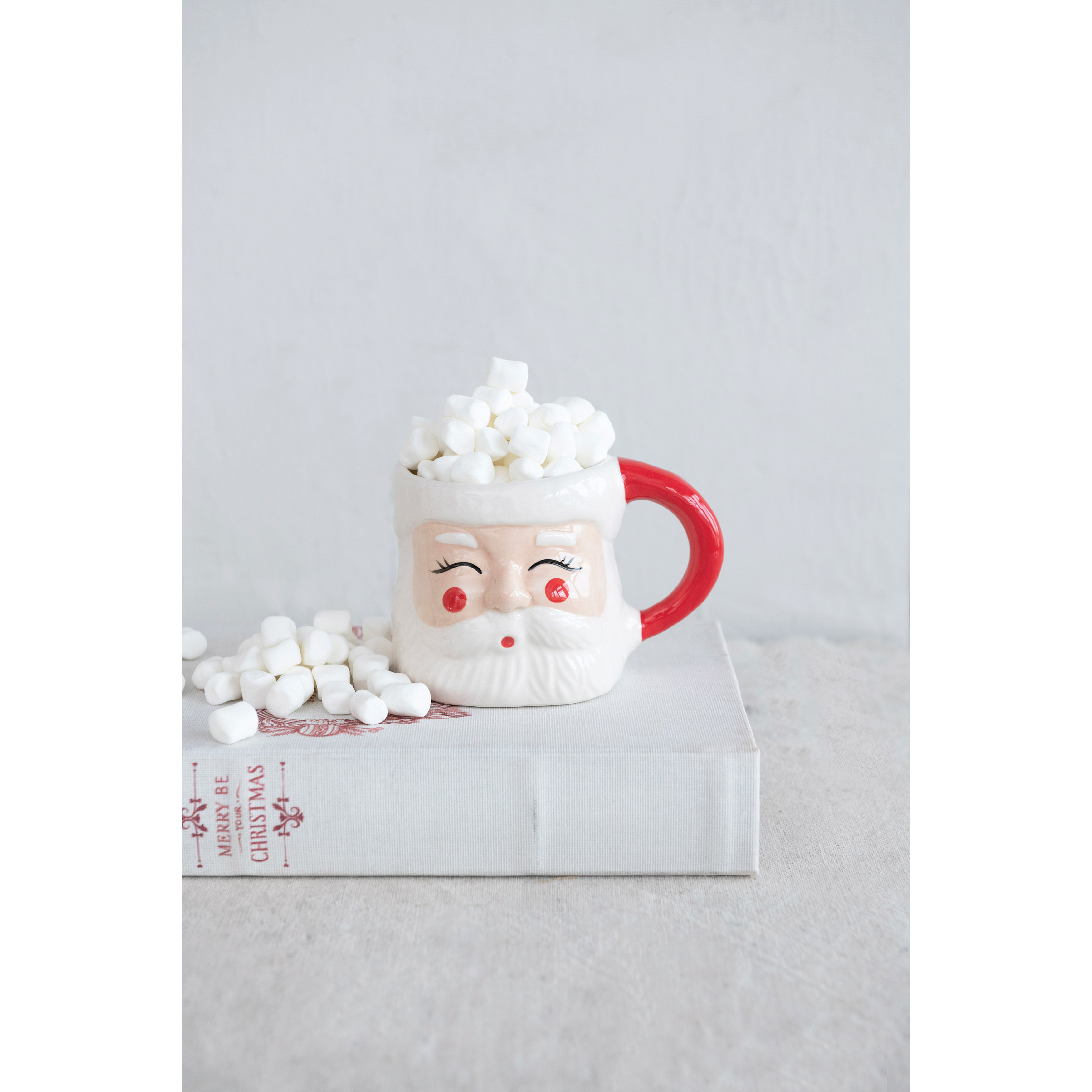 Red and White hand-painted stoneware Santa mug. A reminder of simpler times and the nostalgia of past Christmases. Add to a seasonal display for a dash of whimsical holiday charm.