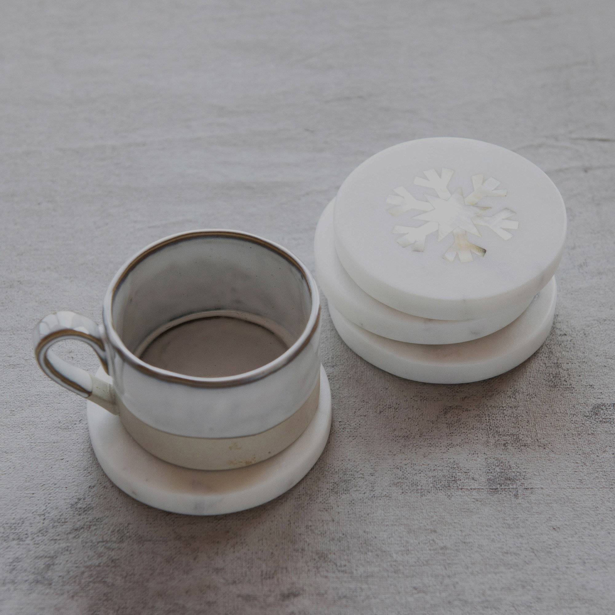 Catalog Name: 4" Round Marble Coasters w/ Mother of Pearl Snowflake Inlay, Set of 4